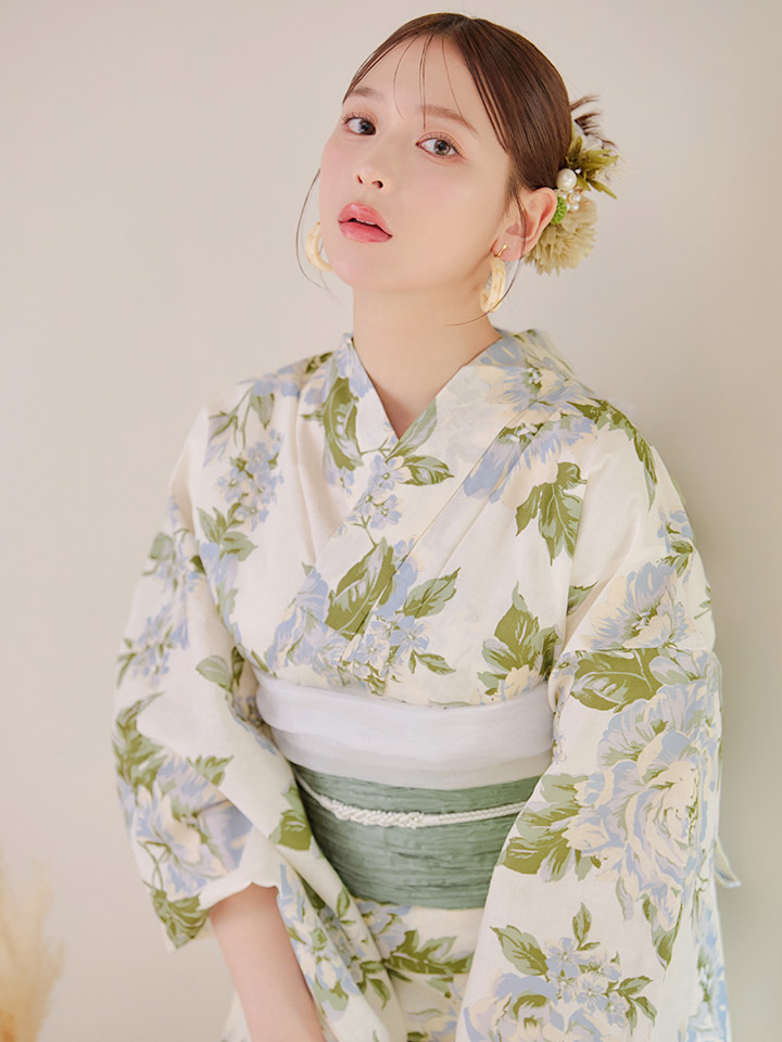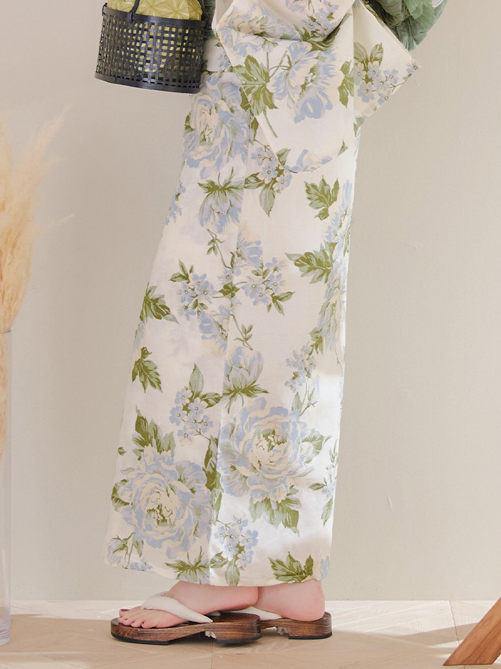 優しいアイボリーの色合いに爽やかなブルーの牡丹が魅せるメリハリが今っぽい、大人浴衣。