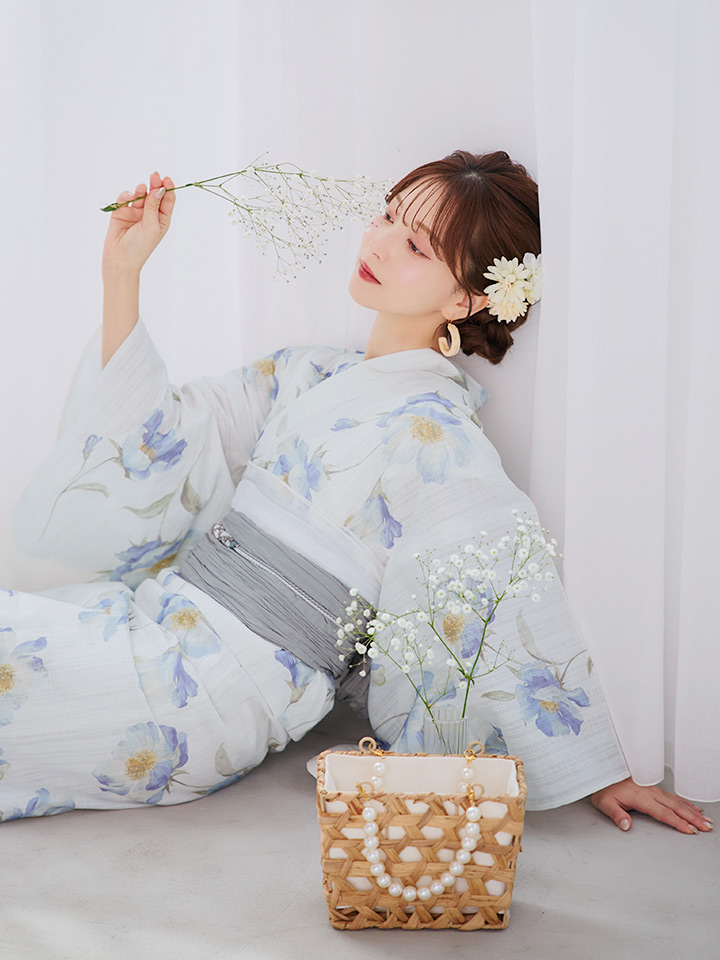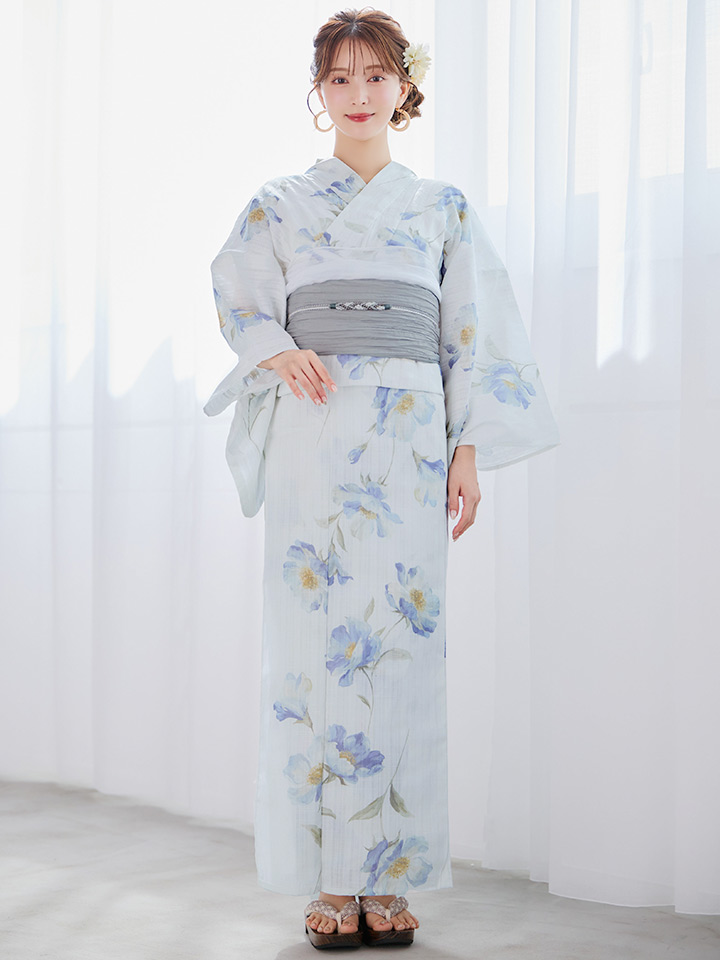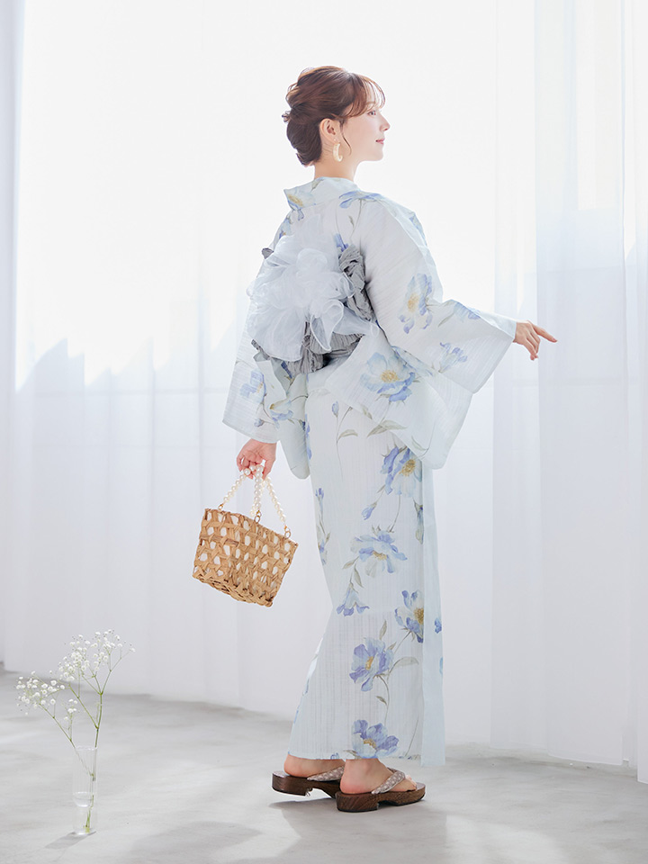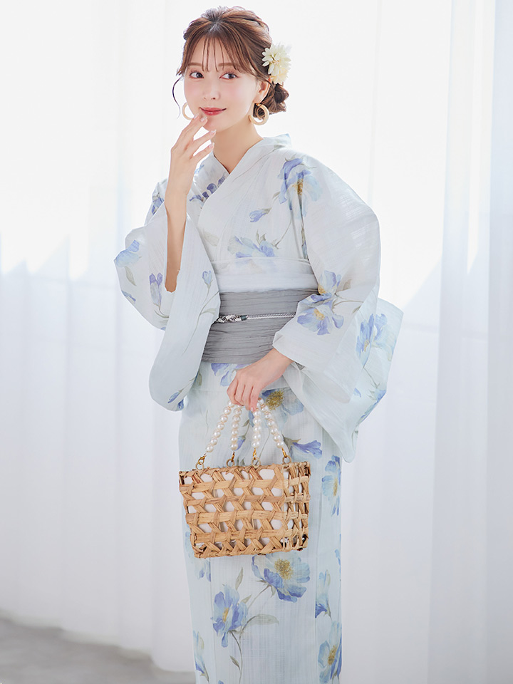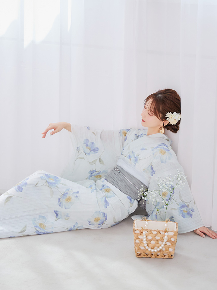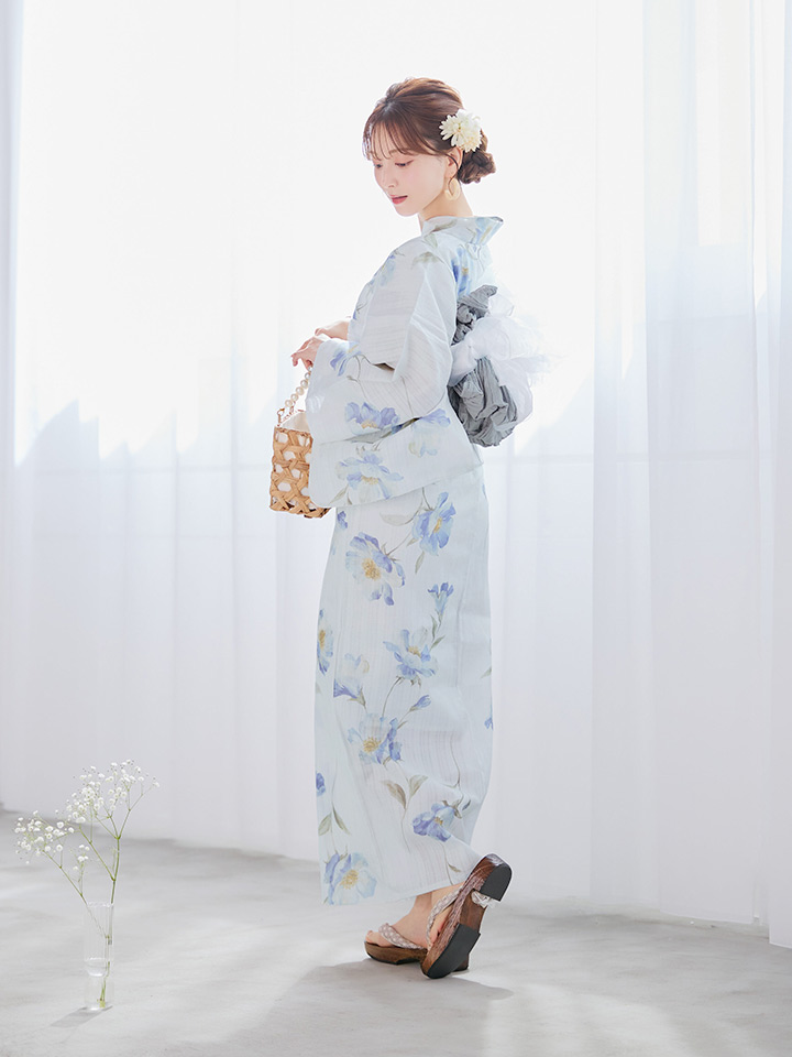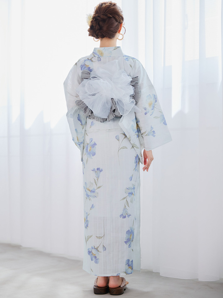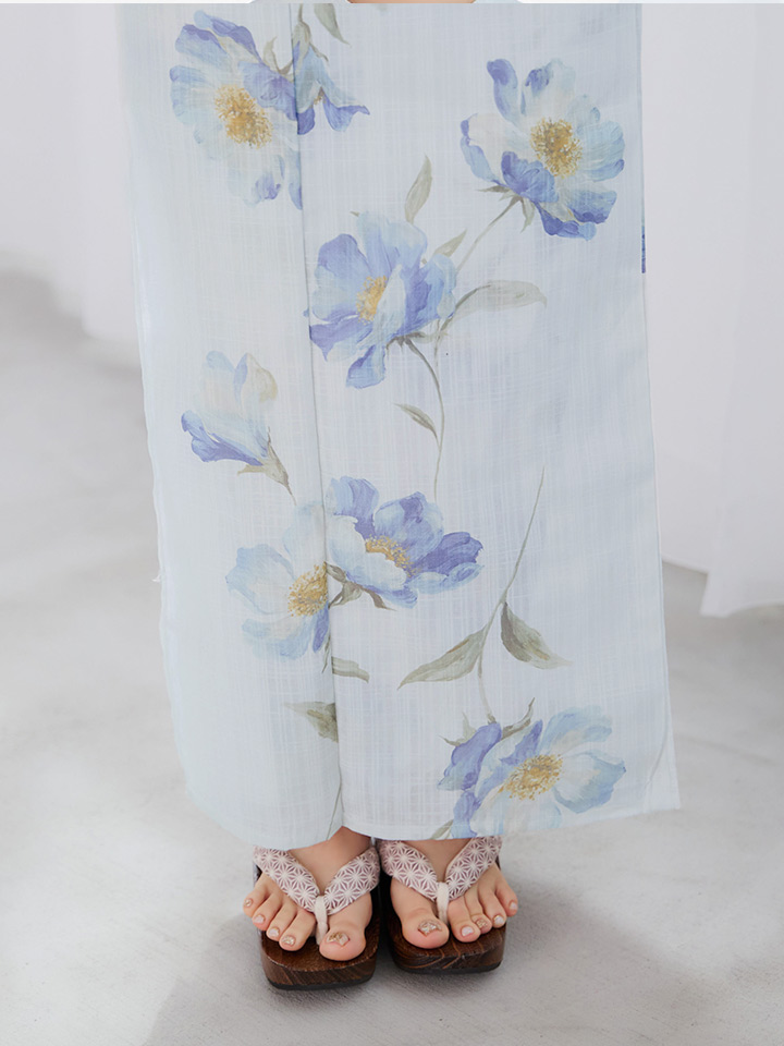 白地に淡くにじむような水彩タッチのブルーの牡丹が描かれた浴衣。