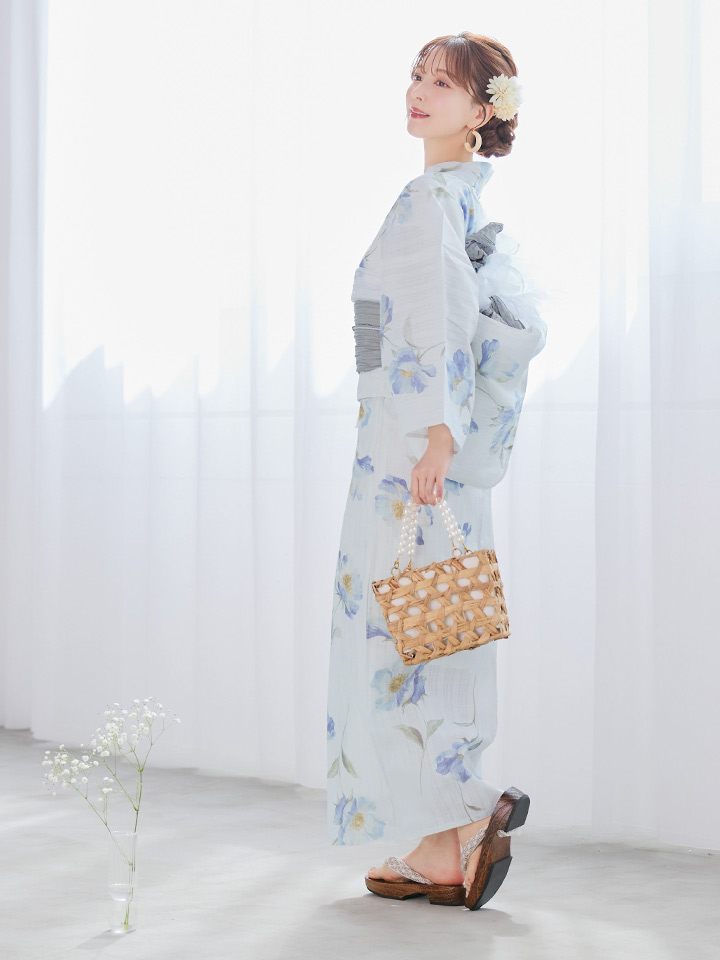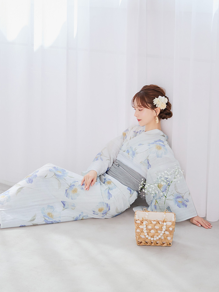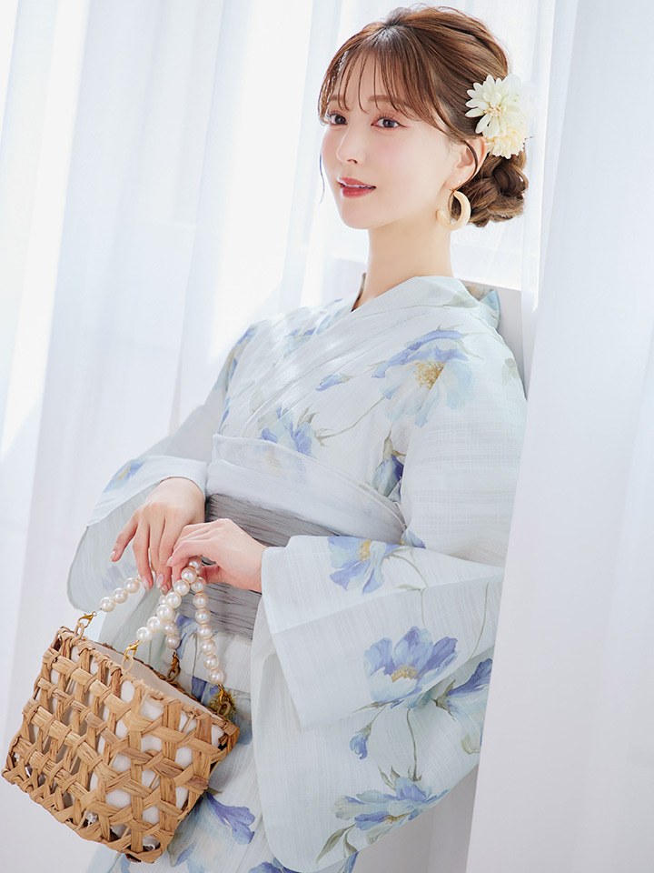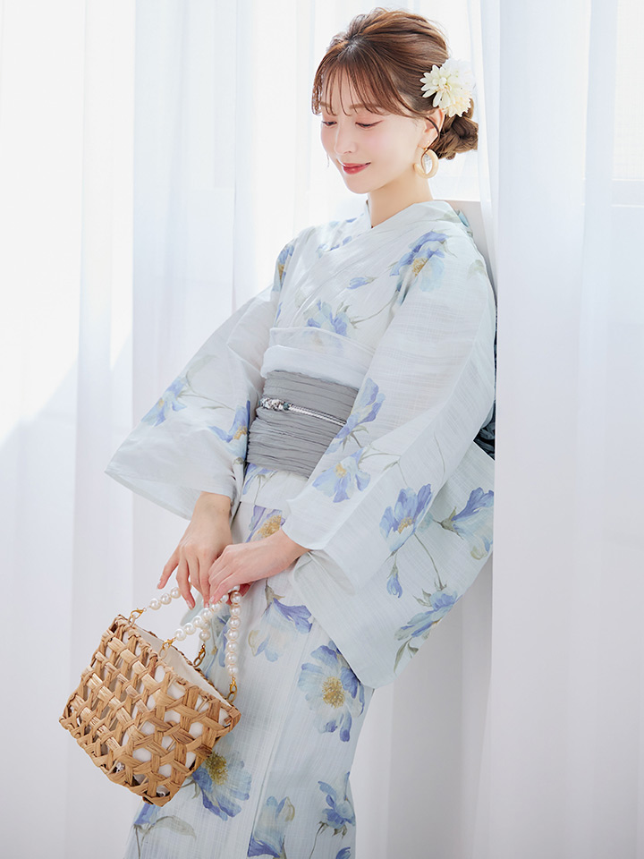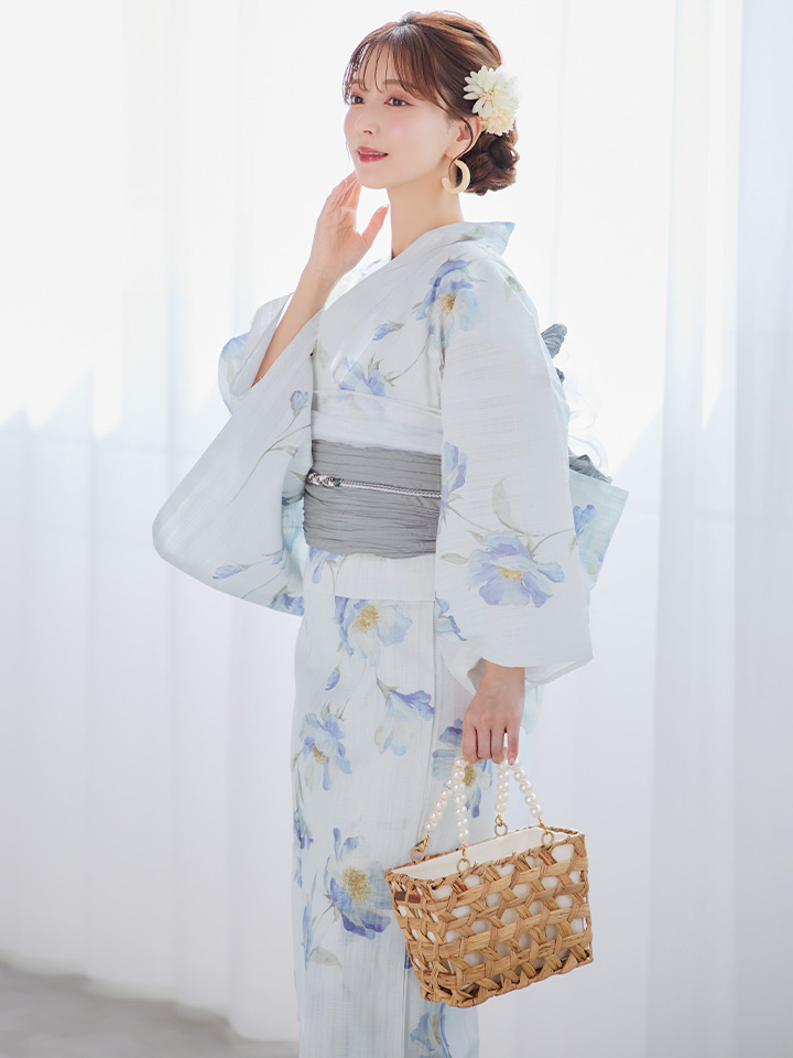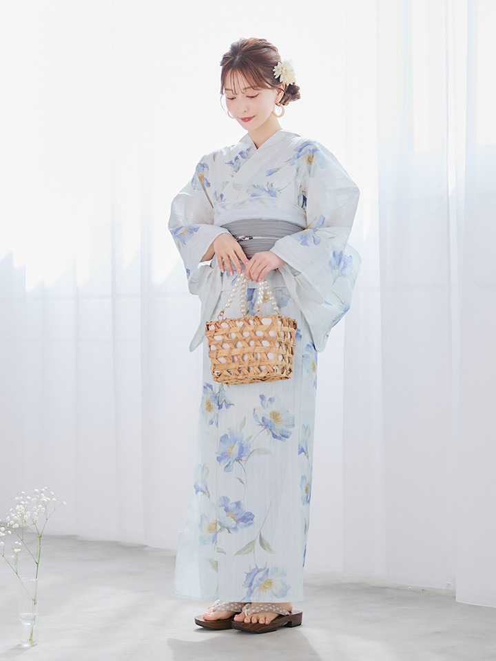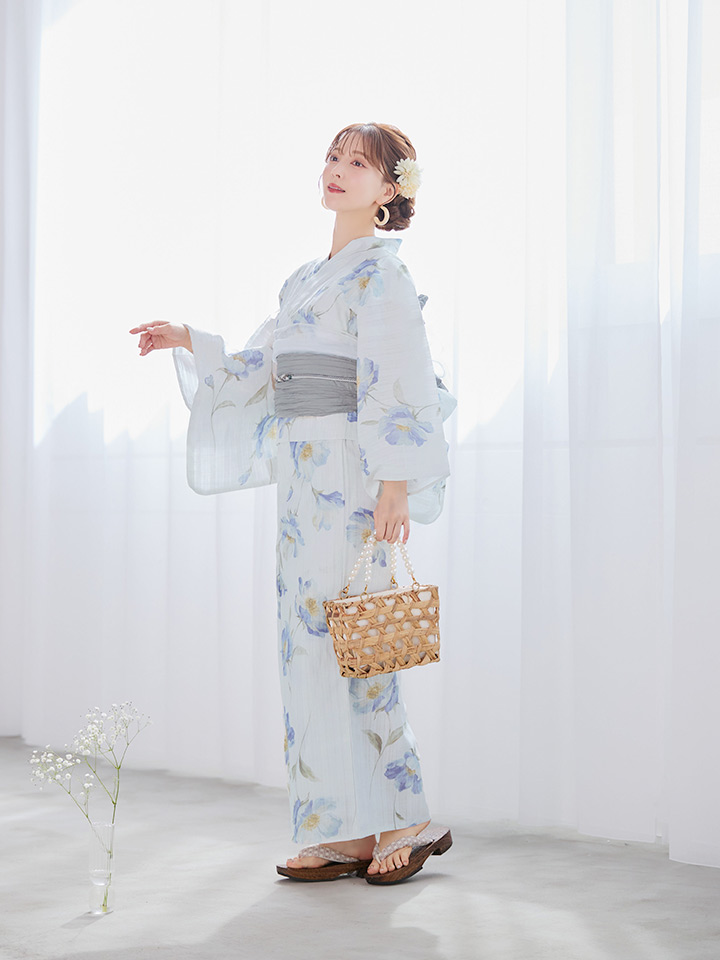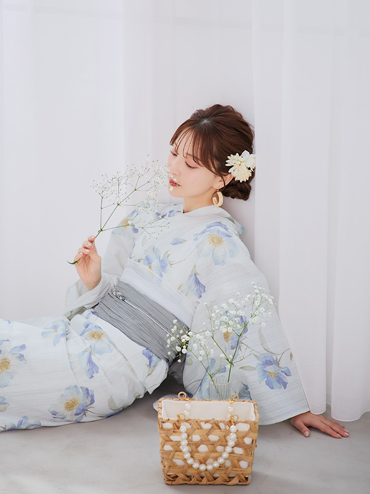 白地に淡くにじむような水彩タッチのブルーの牡丹が描かれた浴衣。
