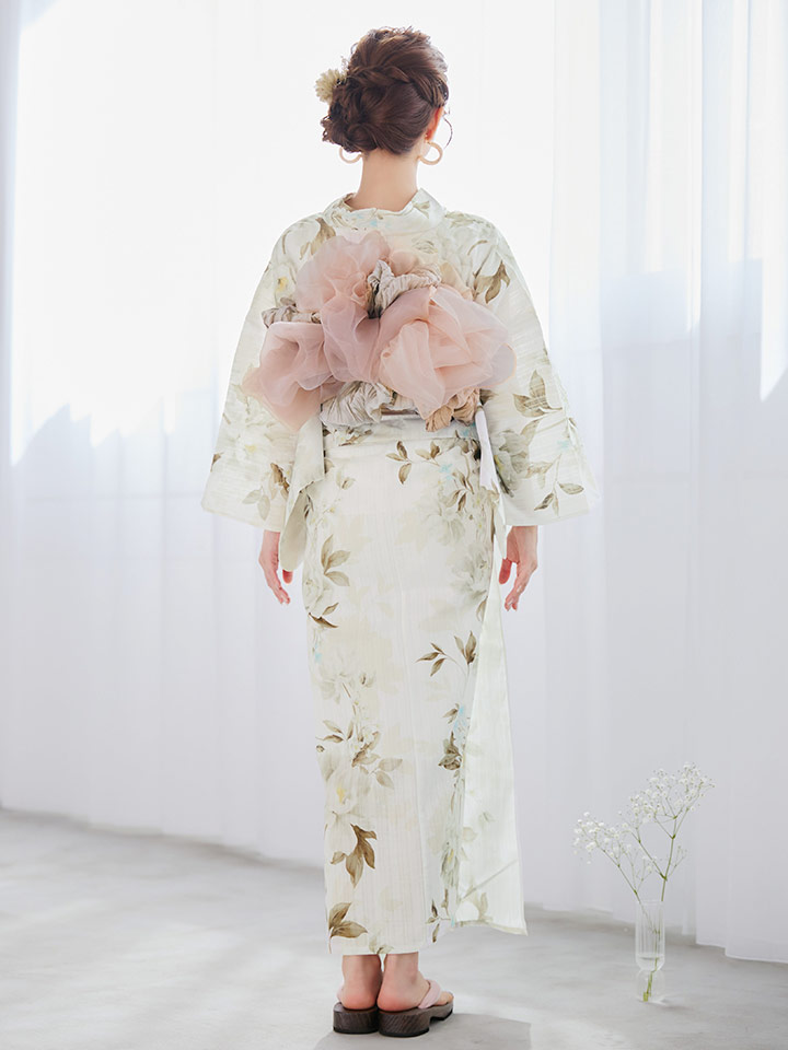 枯れたようなブラウンの葉が舞い、気品ある白牡丹が静かに咲く浴衣。