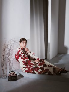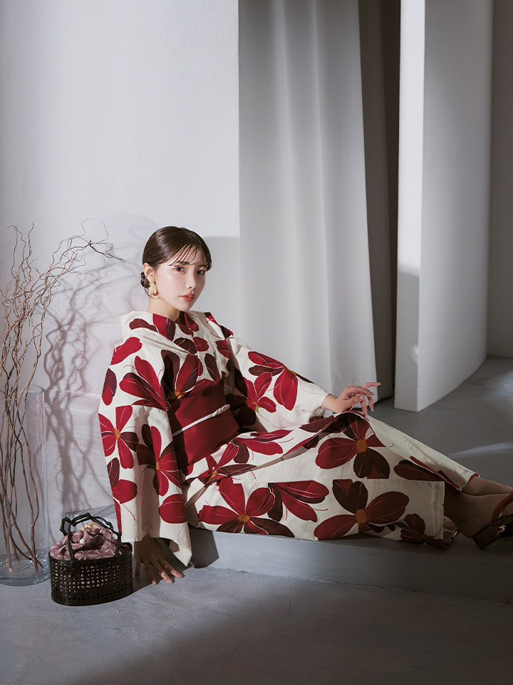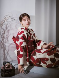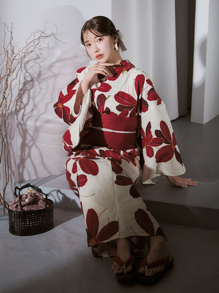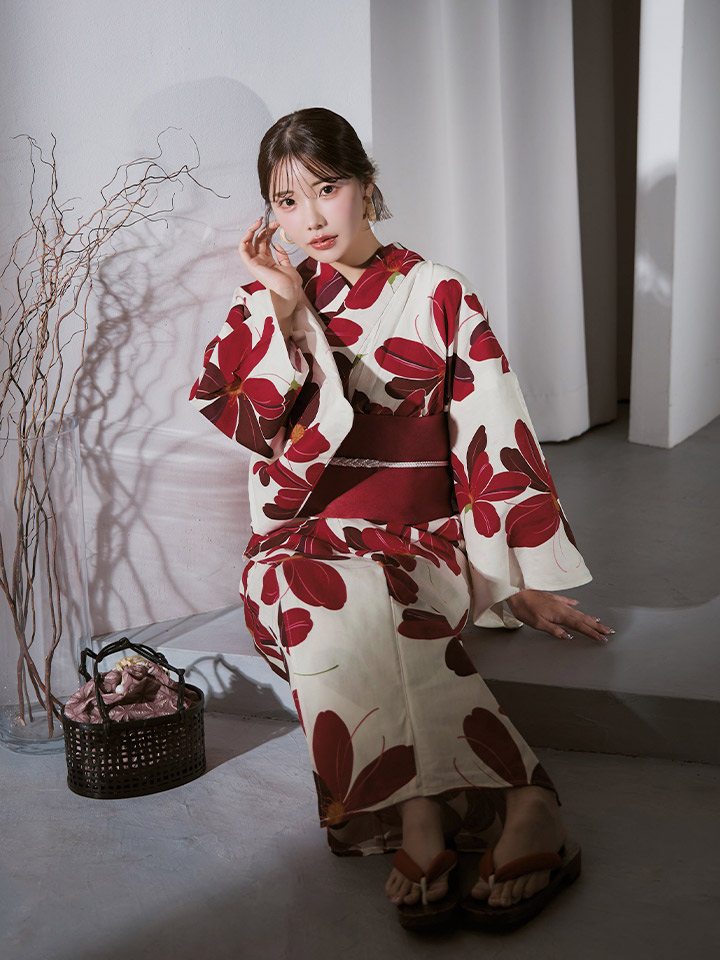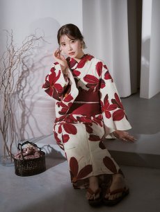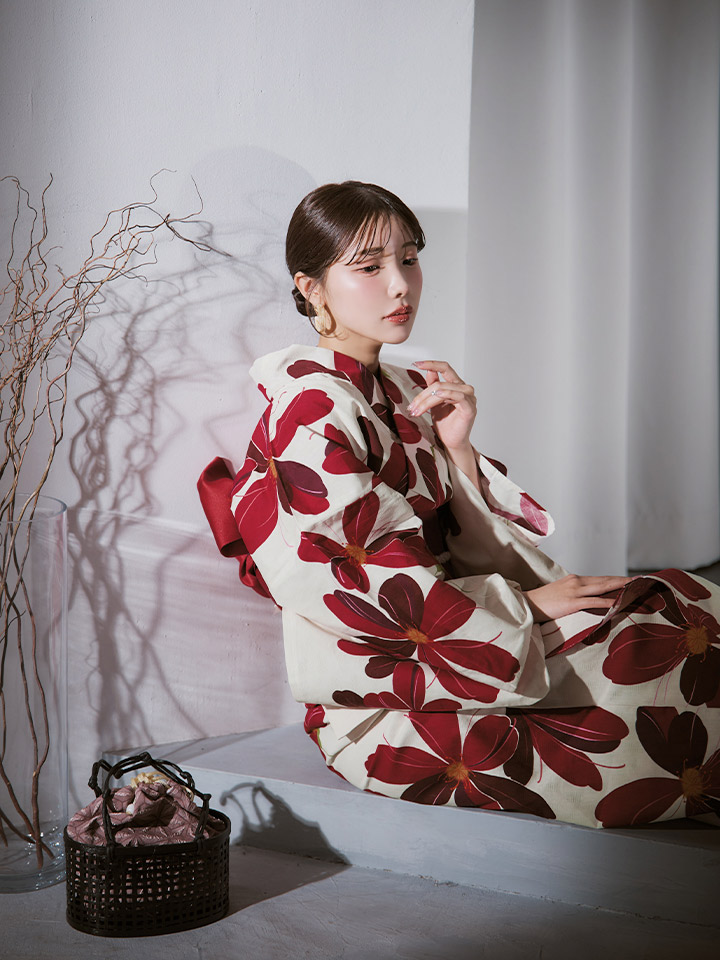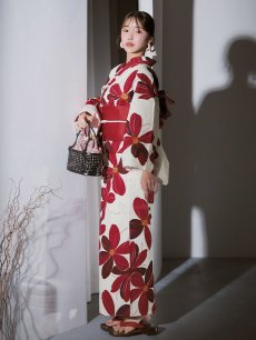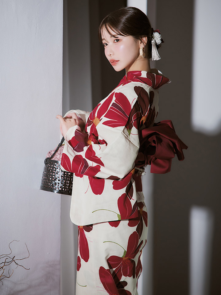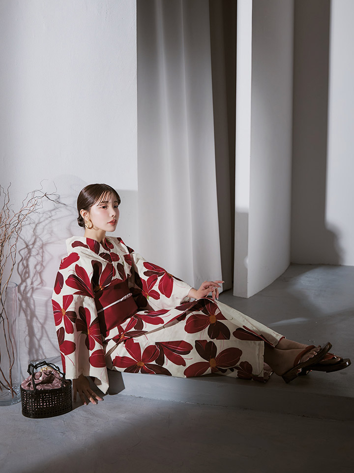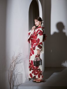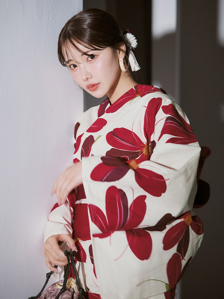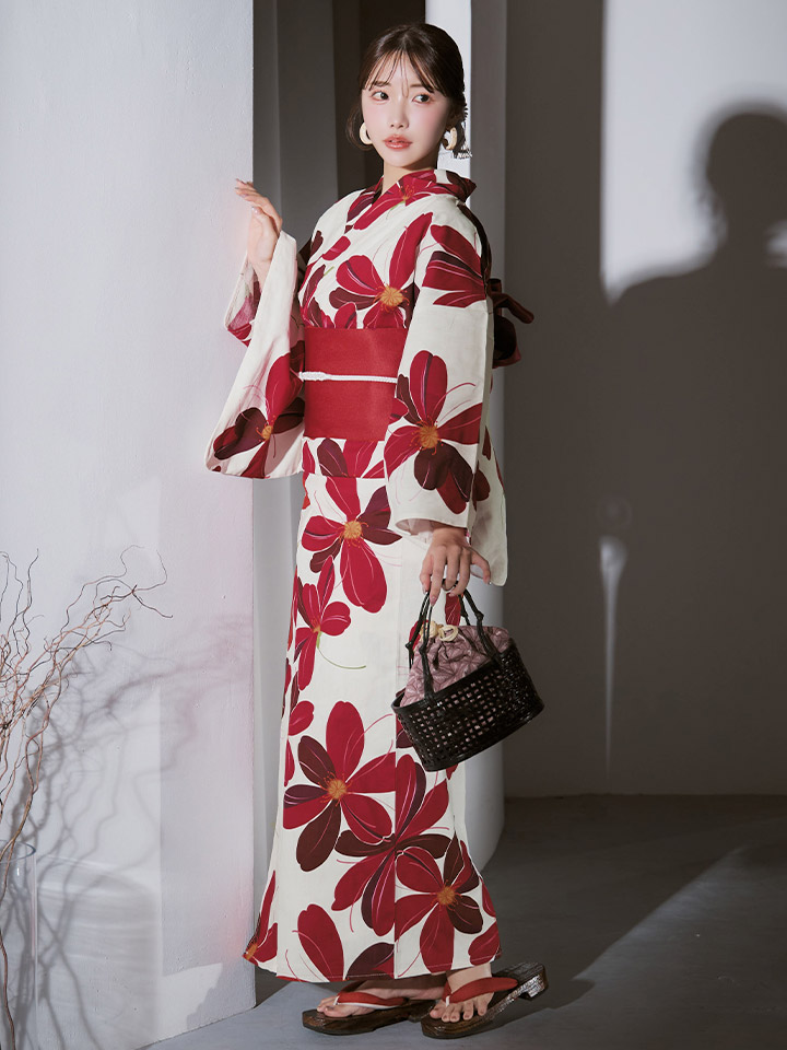 白地に大きな赤い花が描かれた大人綺麗浴衣。