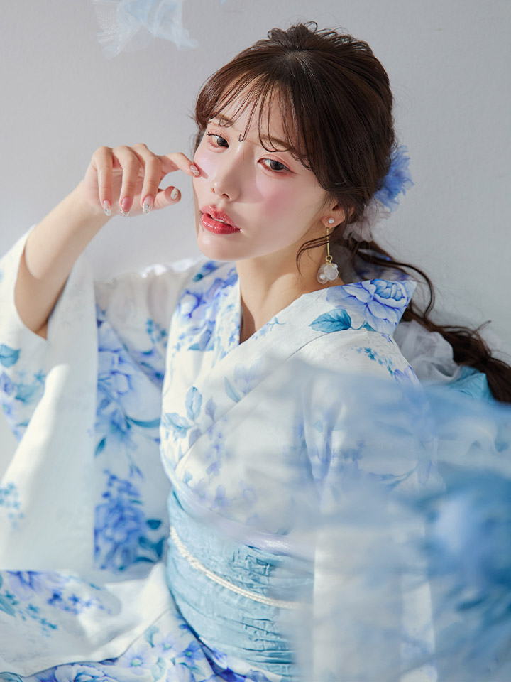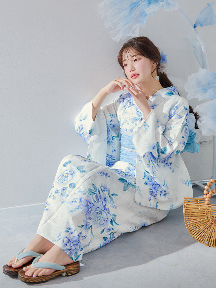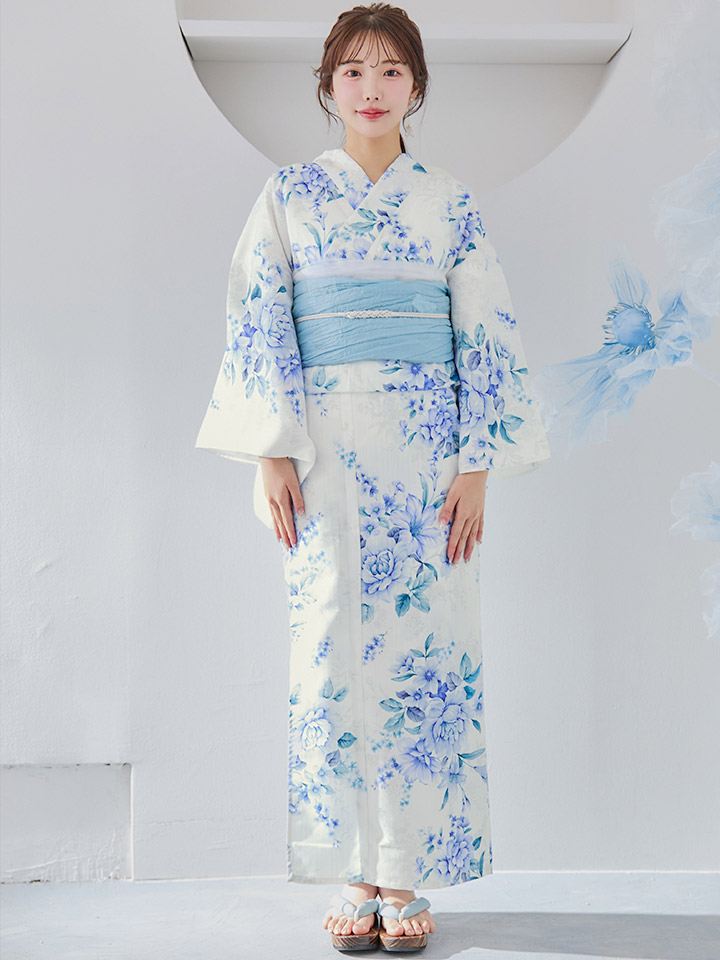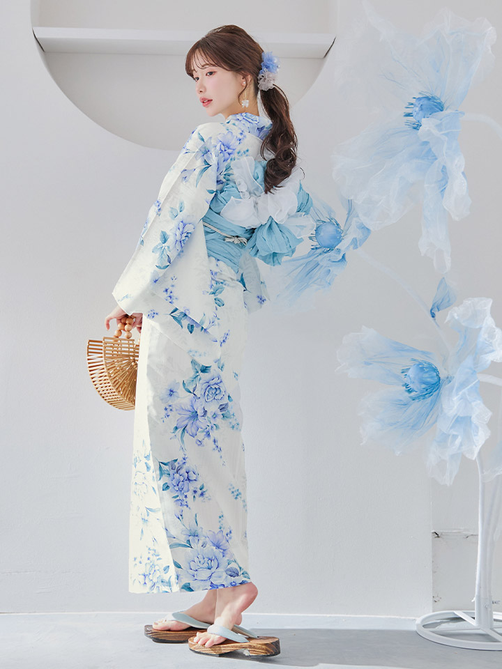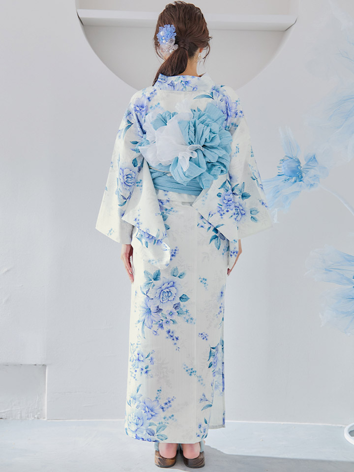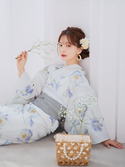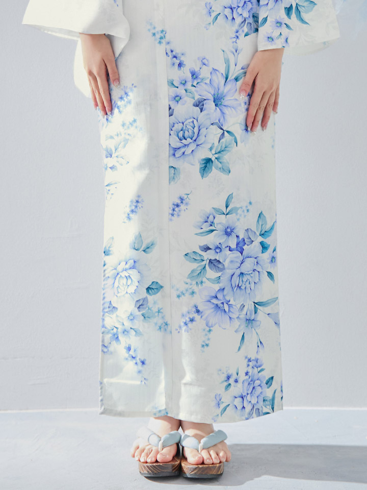 澄み渡る白地に、水色の牡丹やアネモネのような花がふんわりと浮かび上がる浴衣。