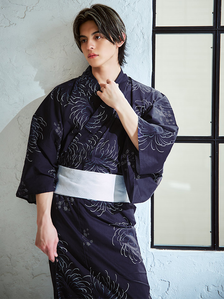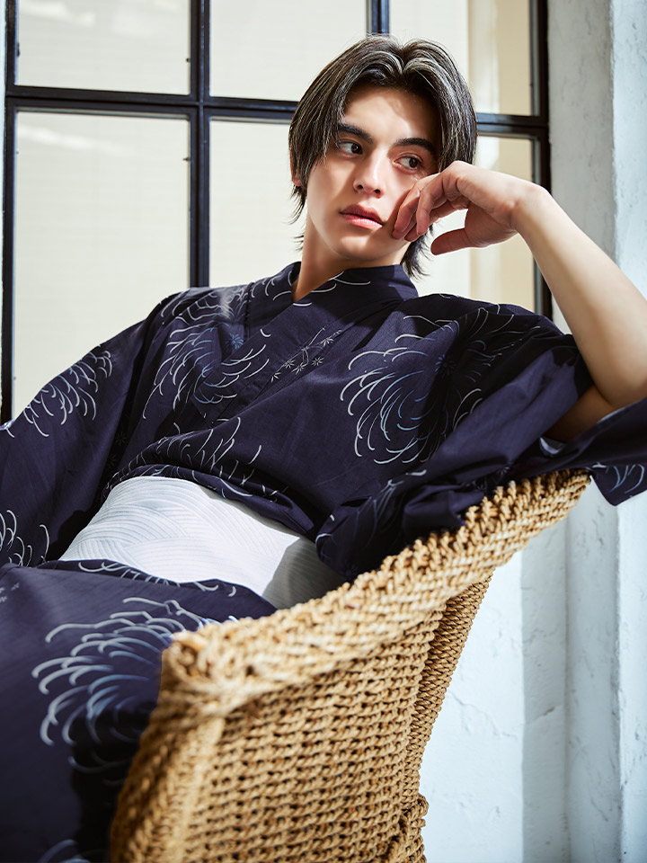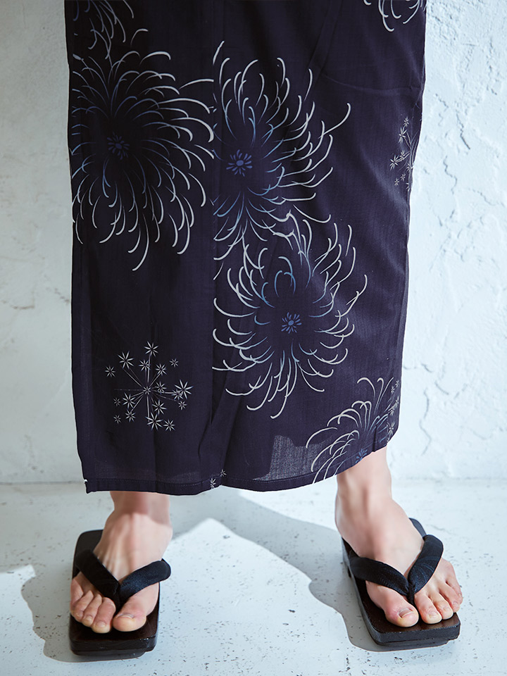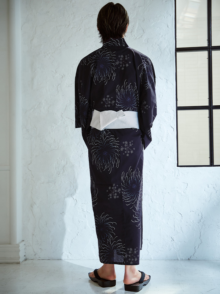 深いネイビーの生地に、大輪の花火が夜空に咲くように描かれた粋な浴衣。