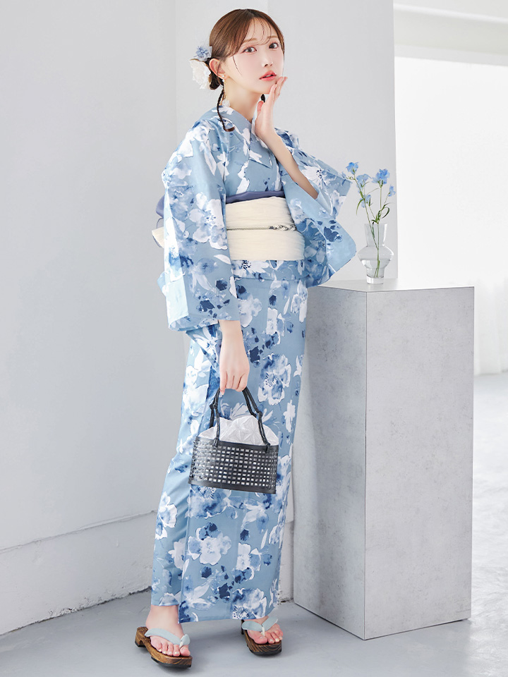 【即日発送】サックスブルーレトロフラワー浴衣 【浴衣3点セット 浴衣/帯/下駄】 [YMT] [Y-9210-kj-BL-F-25YI]