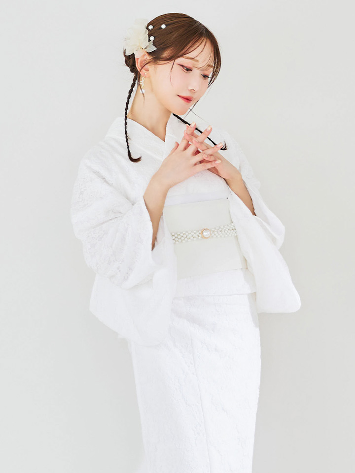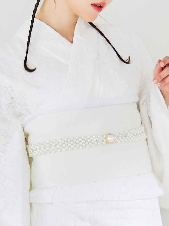 ※オプションのパール帯飾りはそのまま帯の上から結び、後ろの余った部分を帯の中にしまって着付けしております。