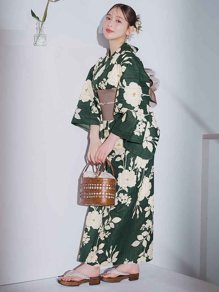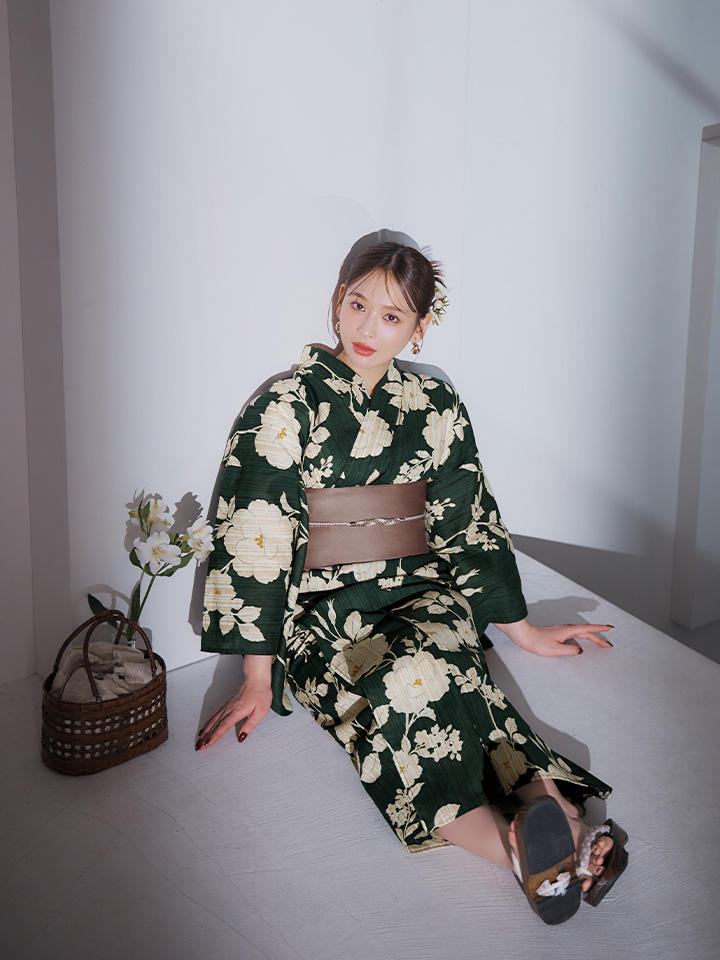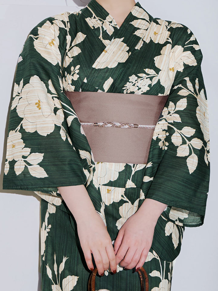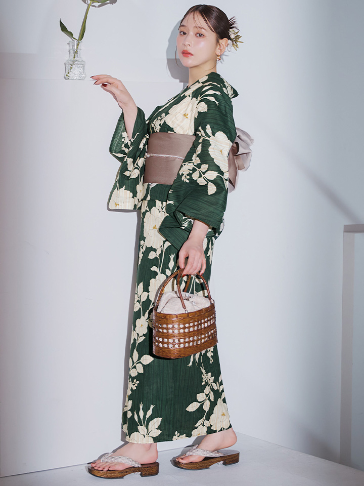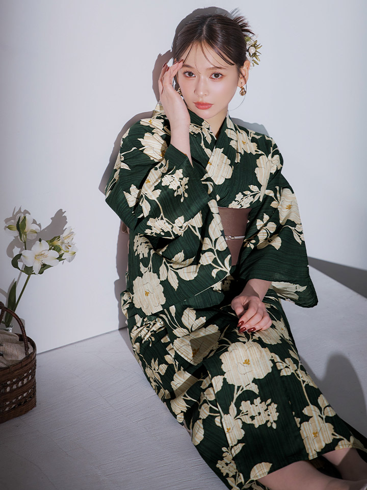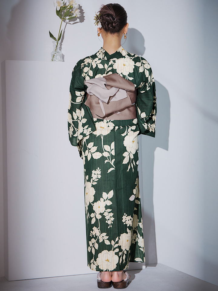 深い緑の地に、気品あふれる白牡丹が咲き誇る大人のための浴衣。