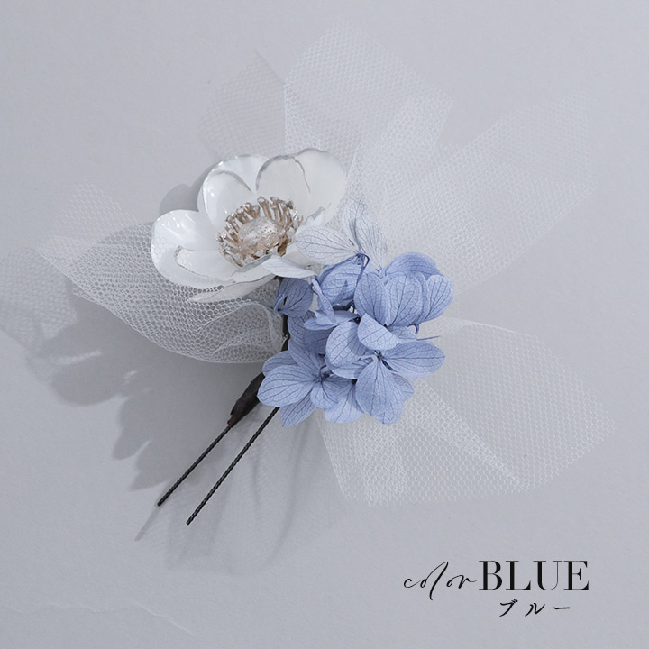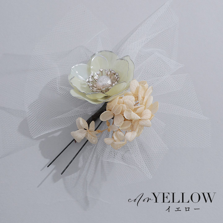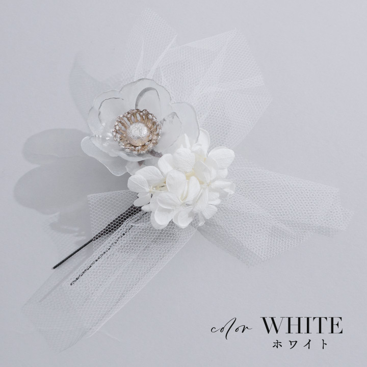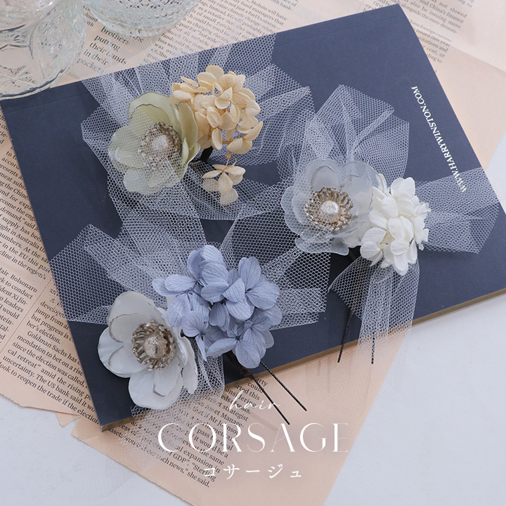 ドライフラワーとハリのある材質のフラワーの組み合わせがポイント!Uピンが使いやすい花モチーフコサージュです。