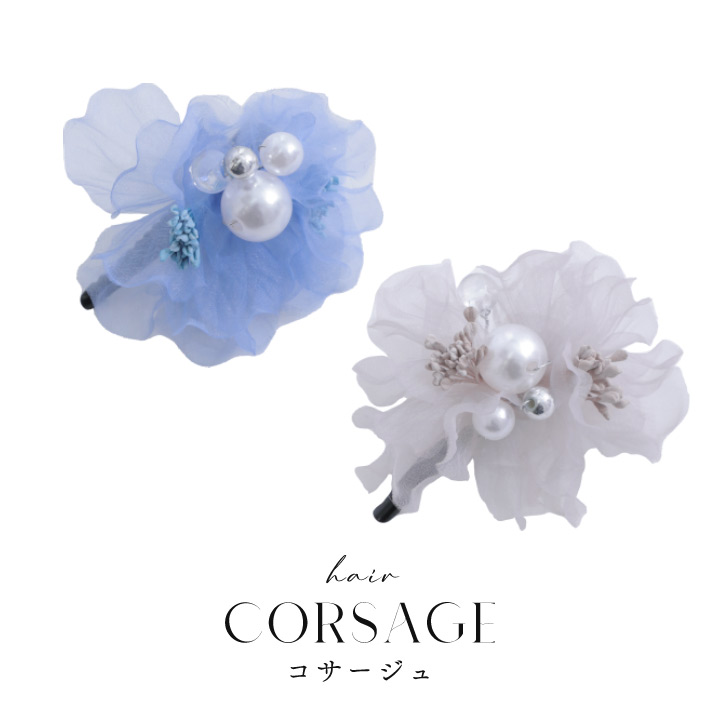 シアー素材のフラワーとパールが印象的なコサージュ浴衣や和装にも勿論、ドレスやパーティーコーデにも◎