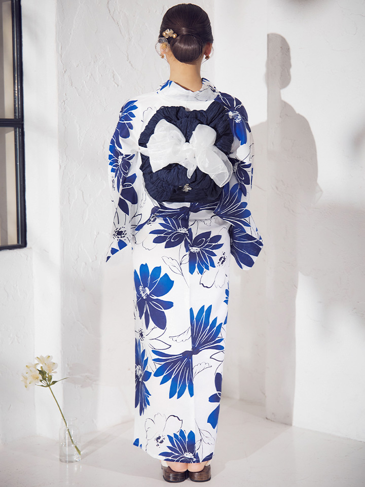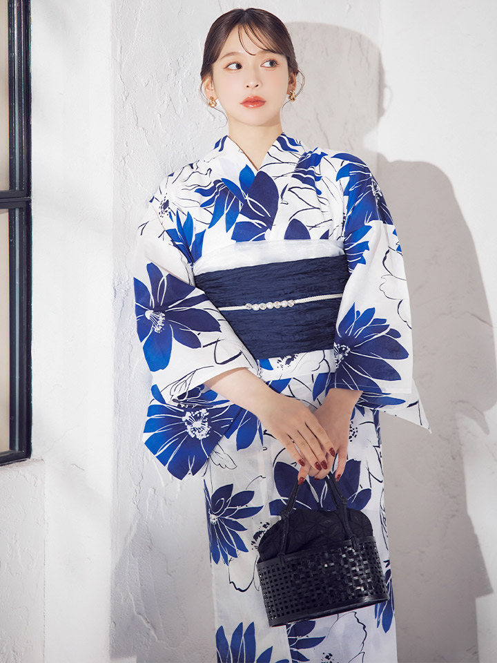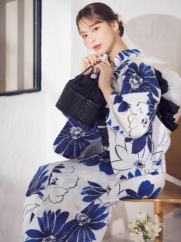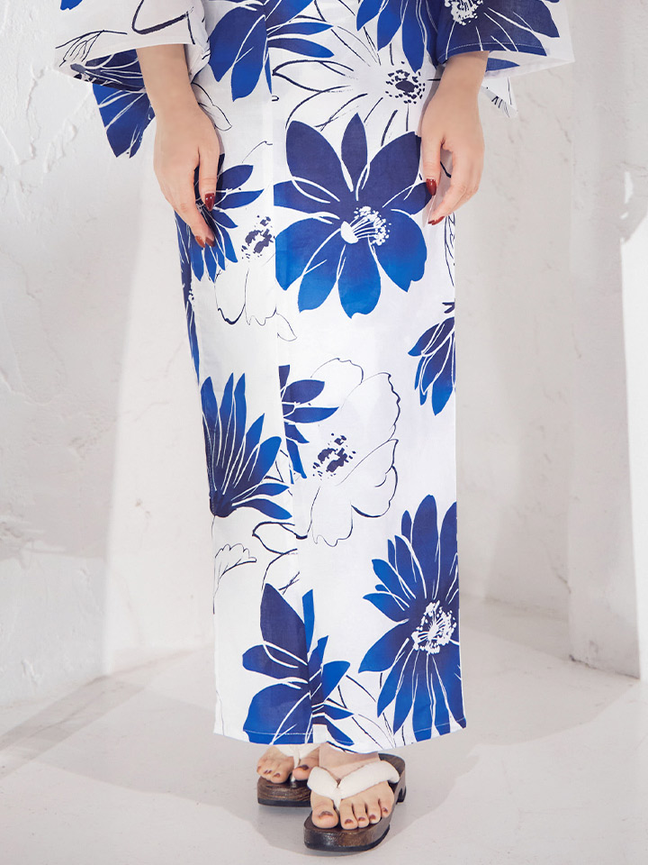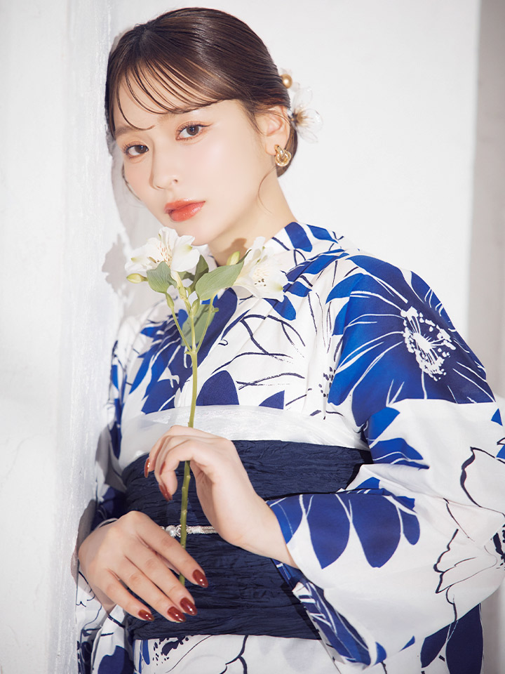 印象に残る大きなブルーフラワーが浴衣コーデに彩りをプラス。