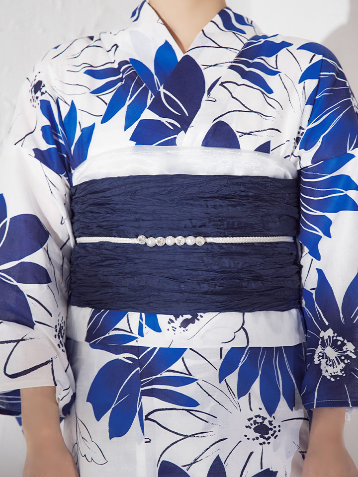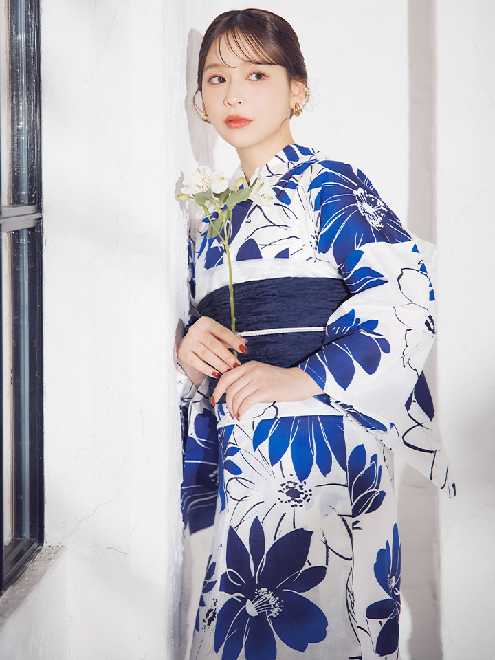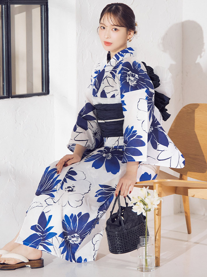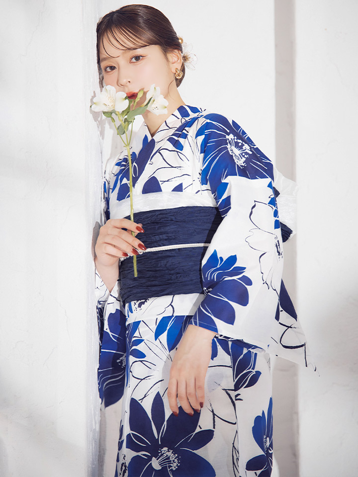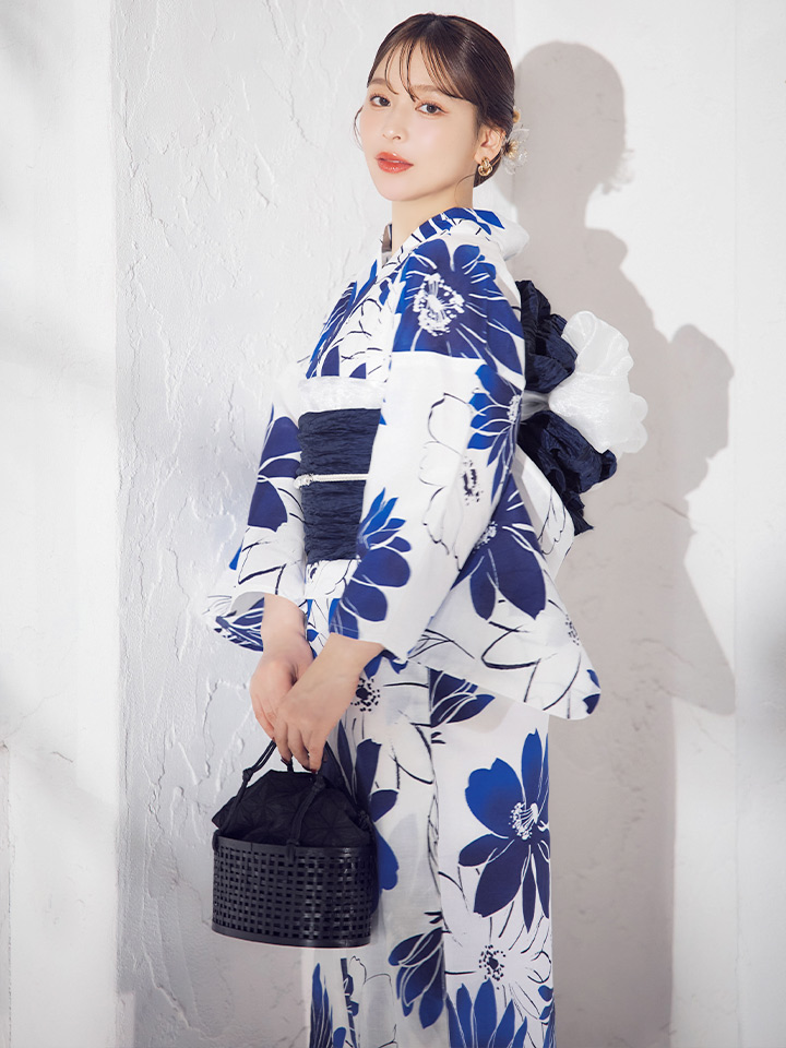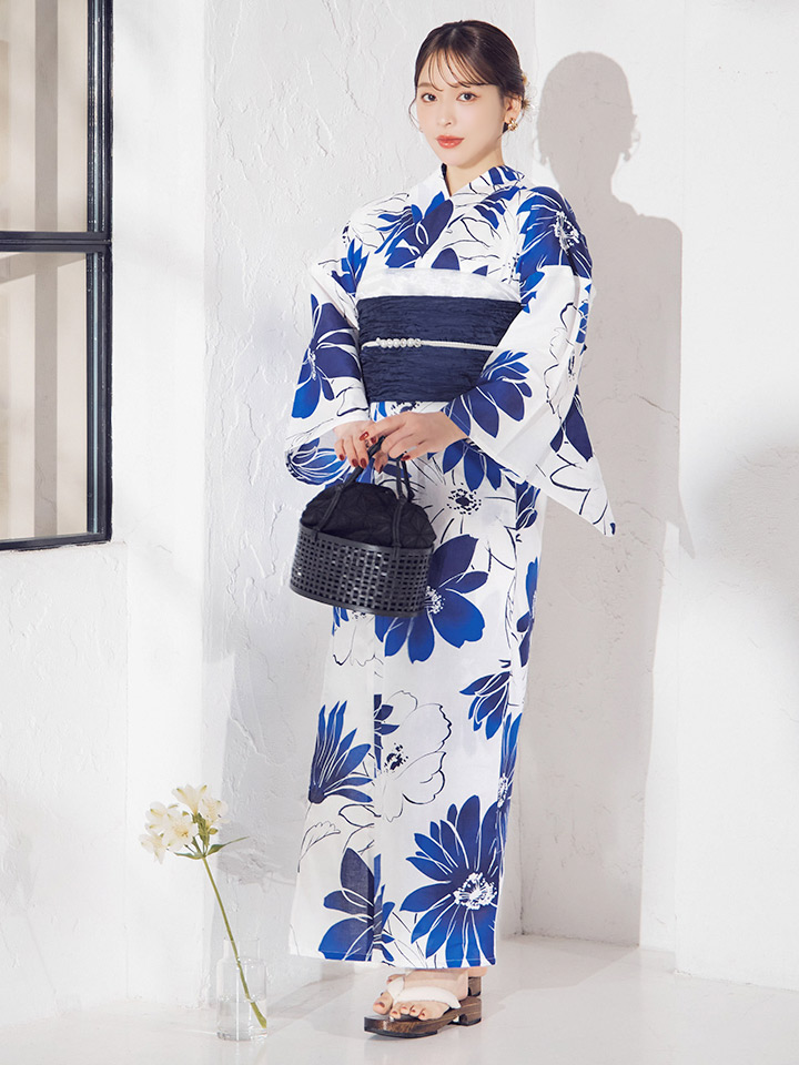 印象に残る大きなブルーフラワーが浴衣コーデに彩りをプラス。