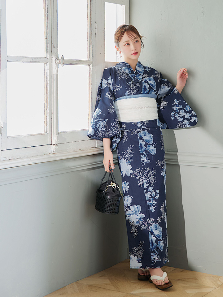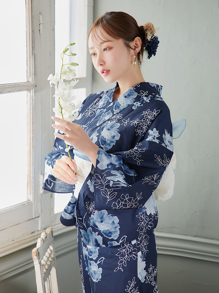 【即日発送】水彩線画フラワー浴衣 【浴衣3点セット 浴衣/帯/下駄】 [YMT] [Y-9227-kj-NV-F-25TC]