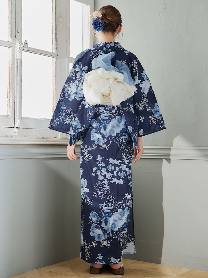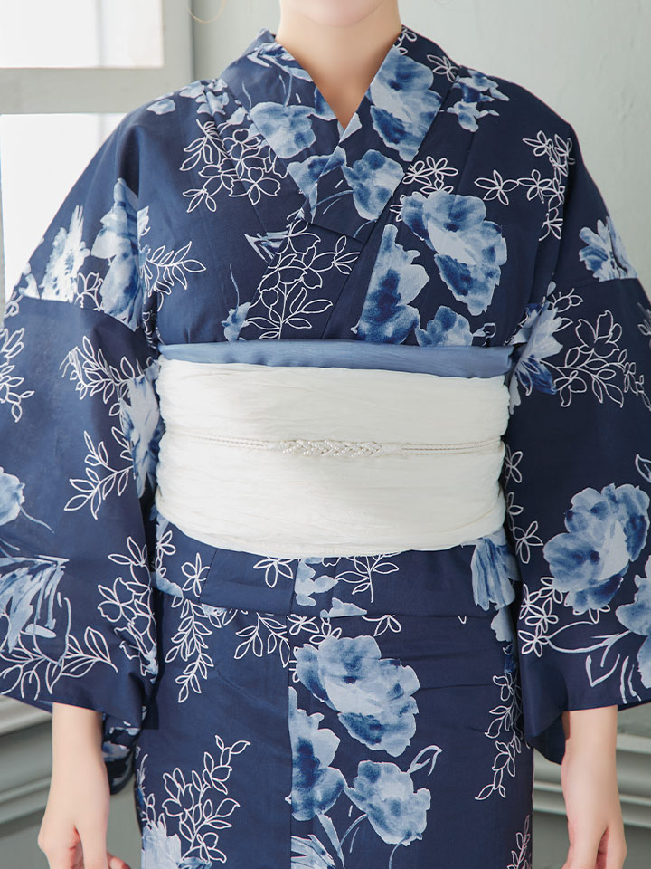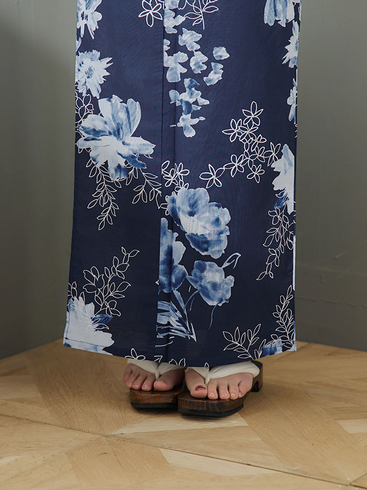 濃紺の浴衣地に水彩と線の花柄を組み合わせた1枚