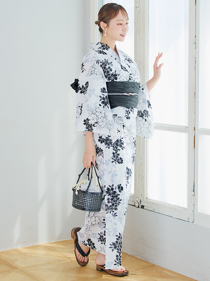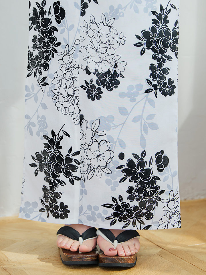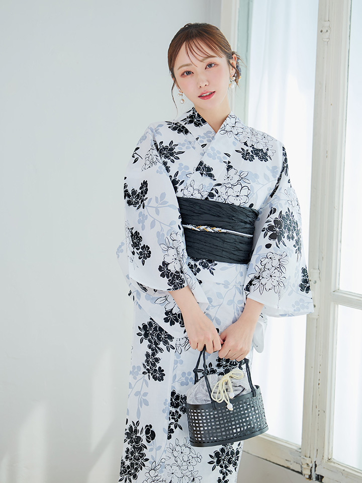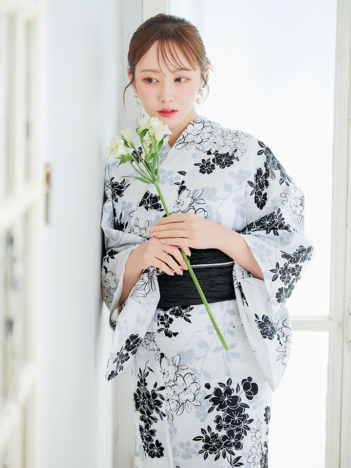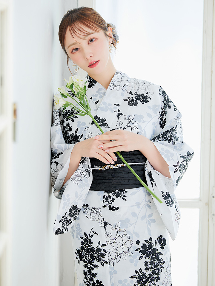 ホワイト地モノトーンの桜をあしらった上品浴衣