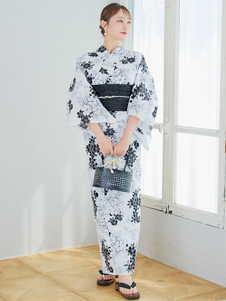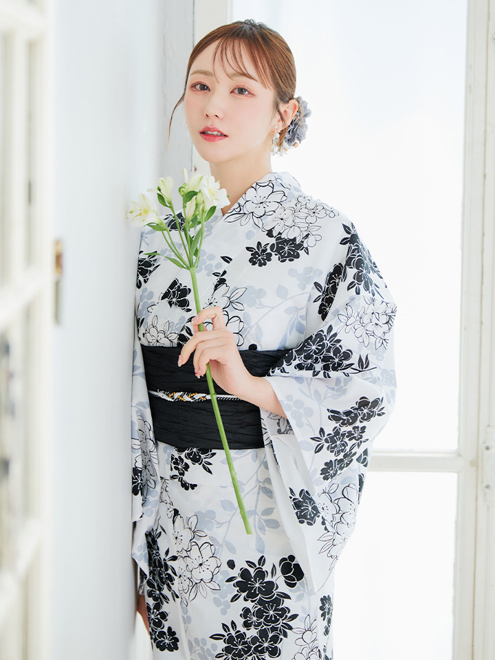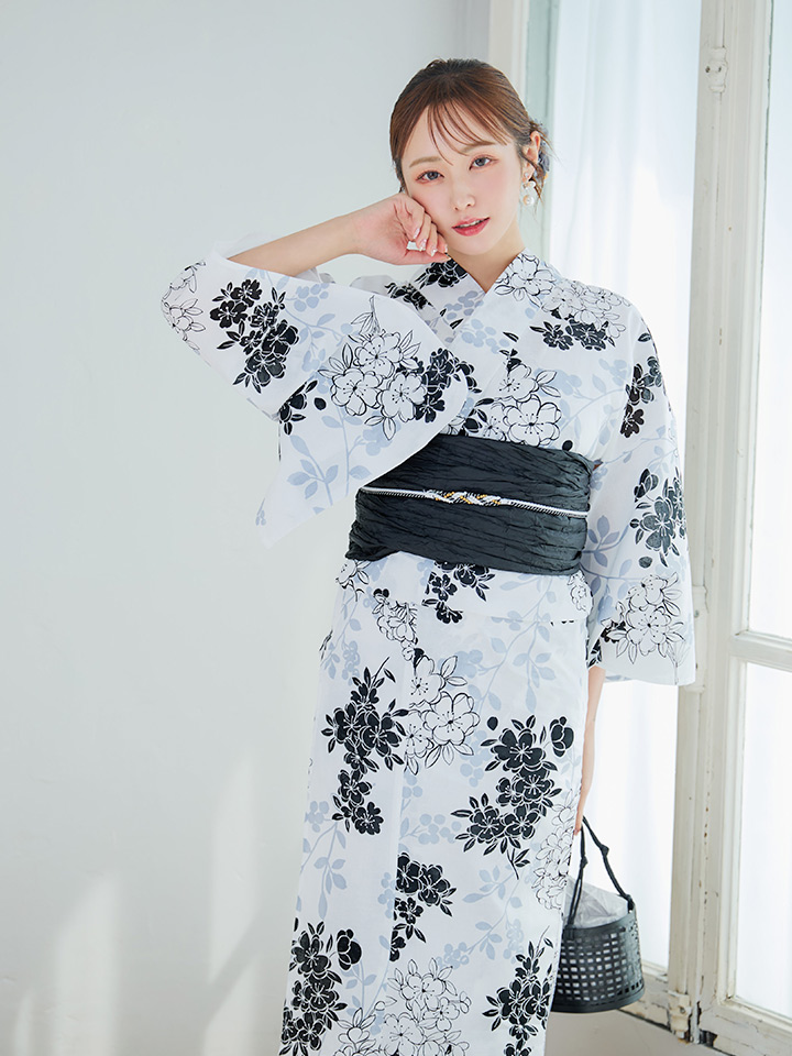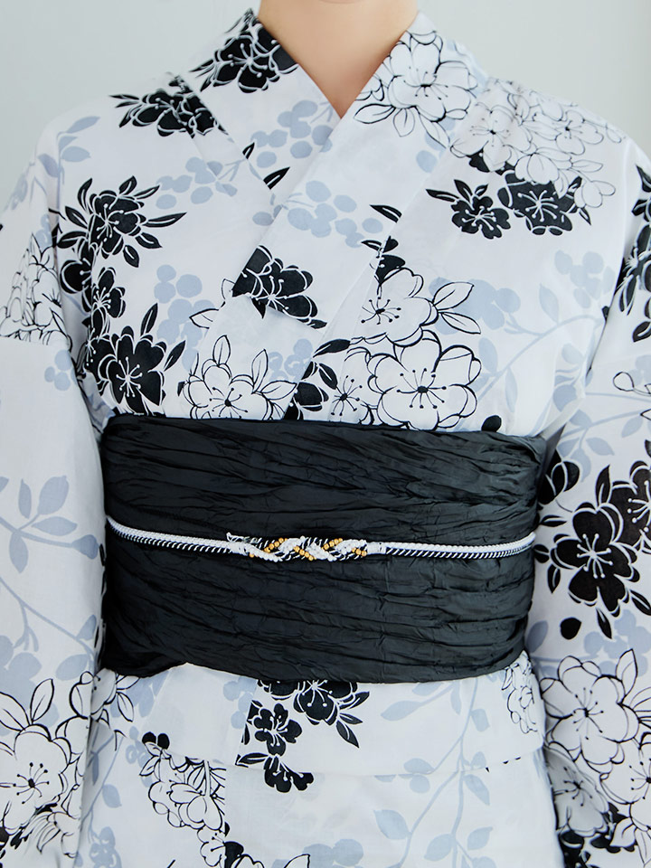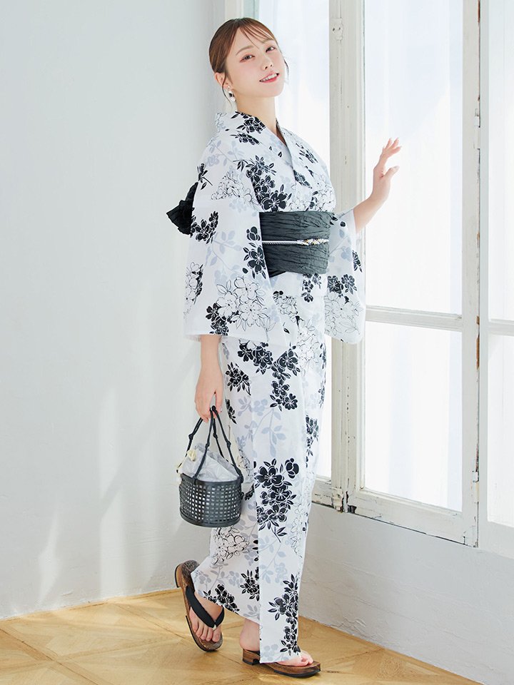 ホワイト地モノトーンの桜をあしらった上品浴衣