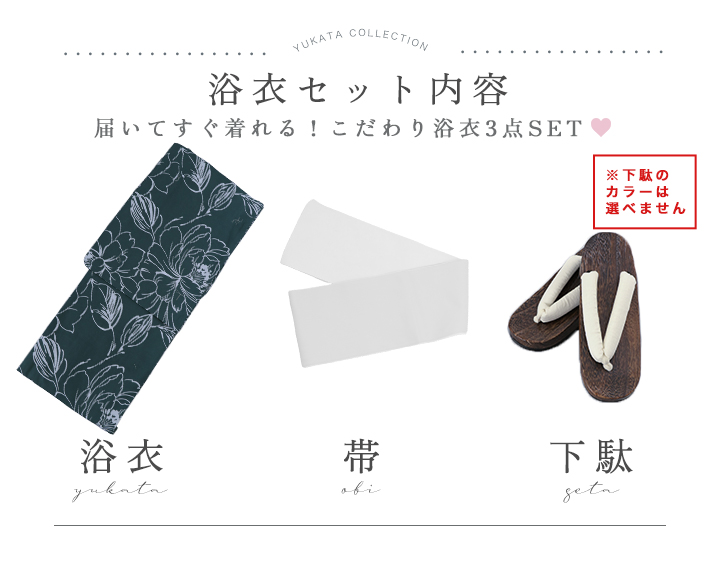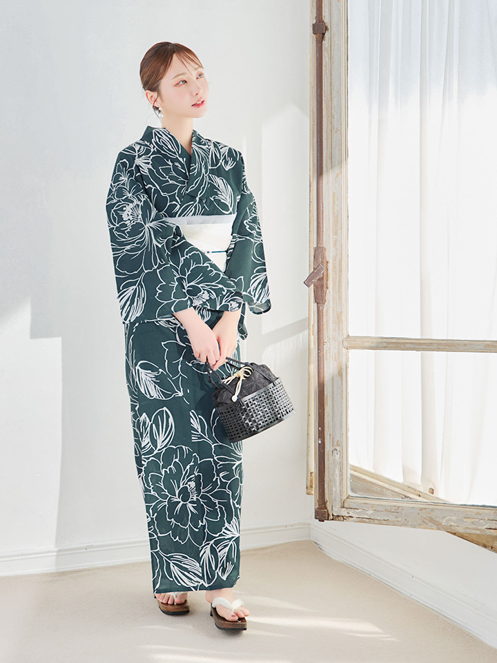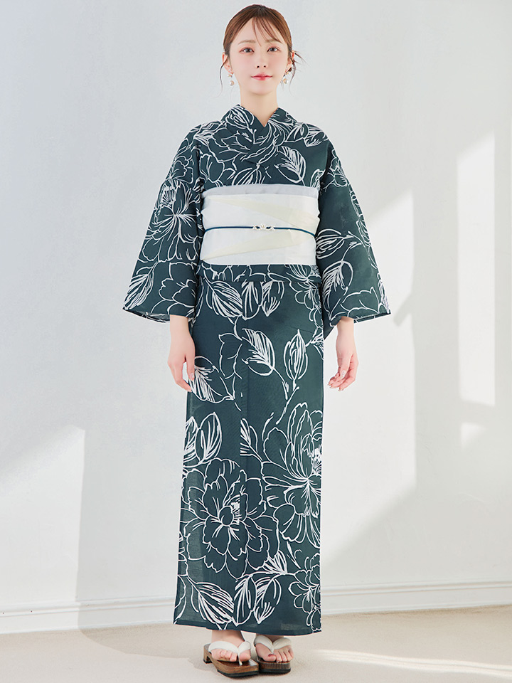 【即日発送】深藍緑線画フラワー浴衣 【浴衣3点セット 浴衣/帯/下駄】 [YMT] [Y-9220-kj-BL-F-25TC]