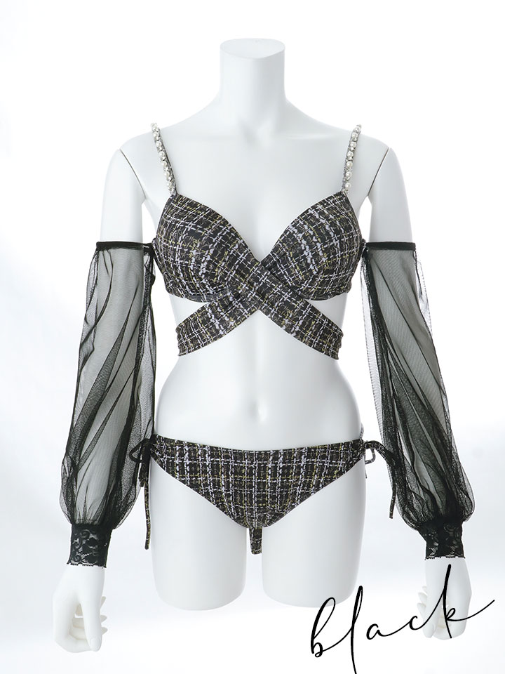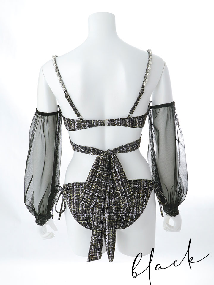 シンプルなブラックビキニに、透け感のあるシアースリーブをプラスした大人なデザイン。