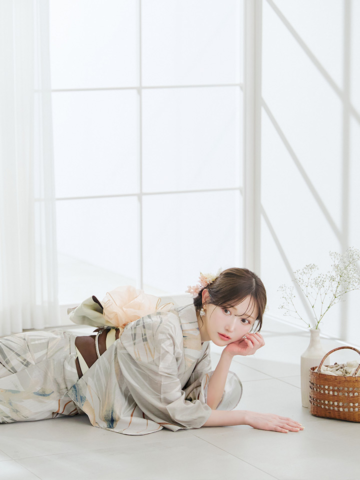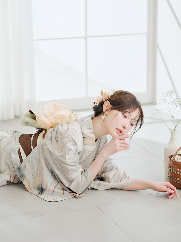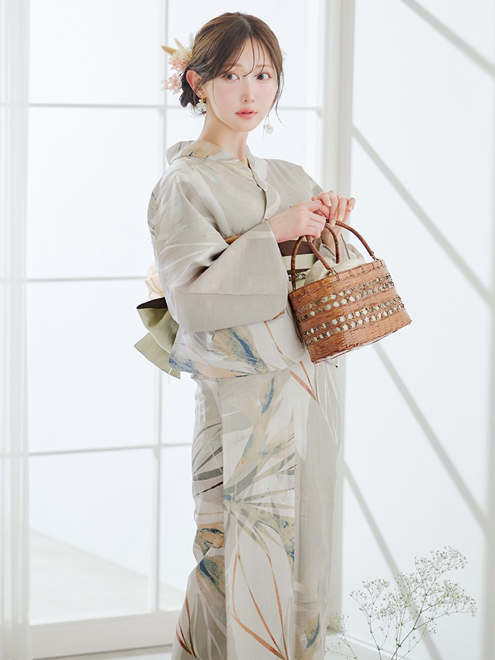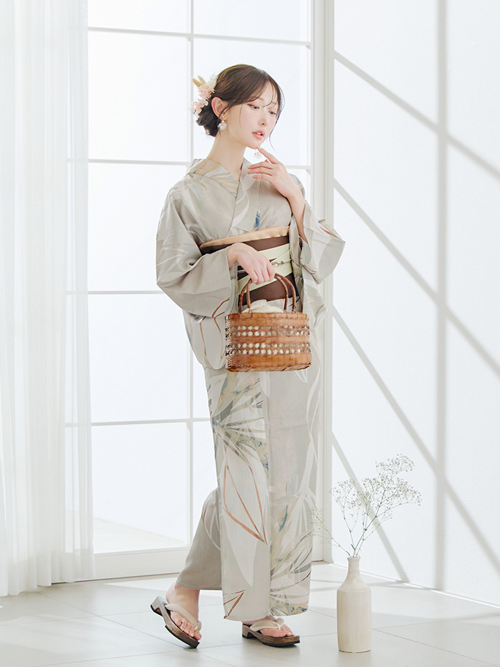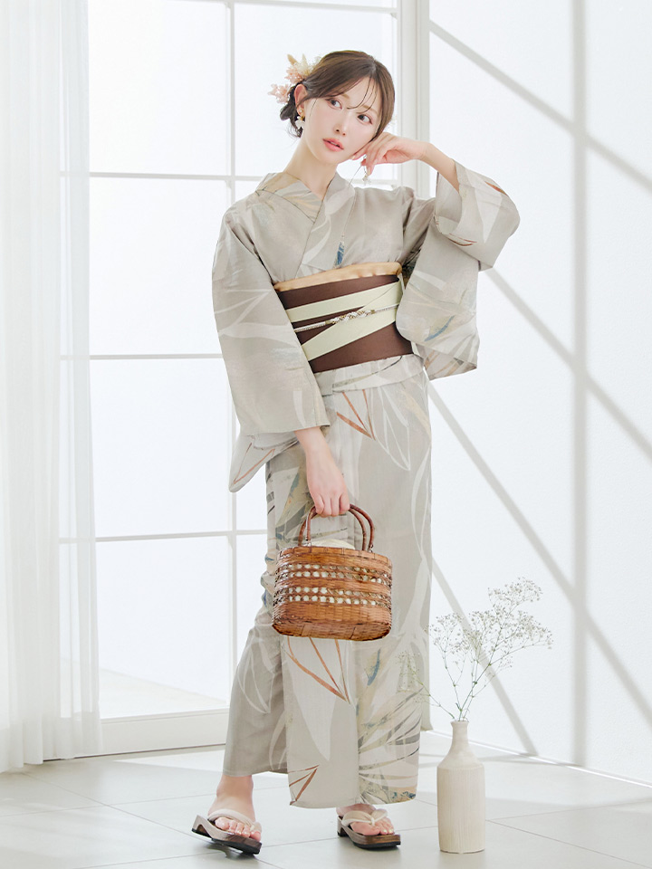 【即日発送】【浴衣セール!】ヘルシーリーフ柄ベージュ浴衣 【浴衣3点セット 浴衣/帯/下駄】 [YMT] [Y-8032-nz-dzh-BE-F-25YI]