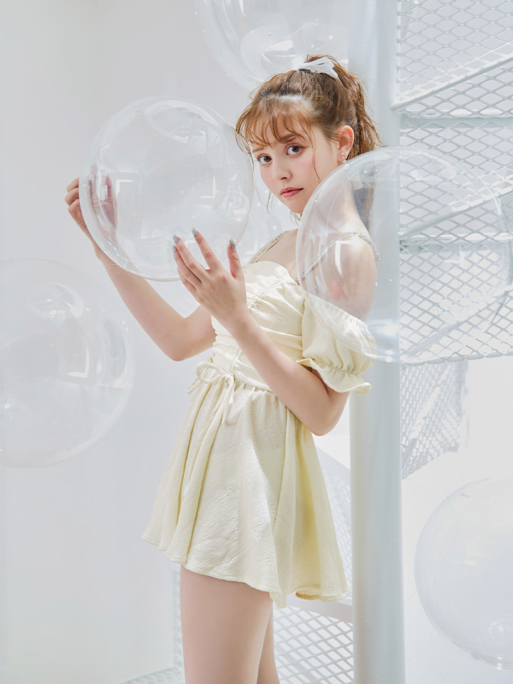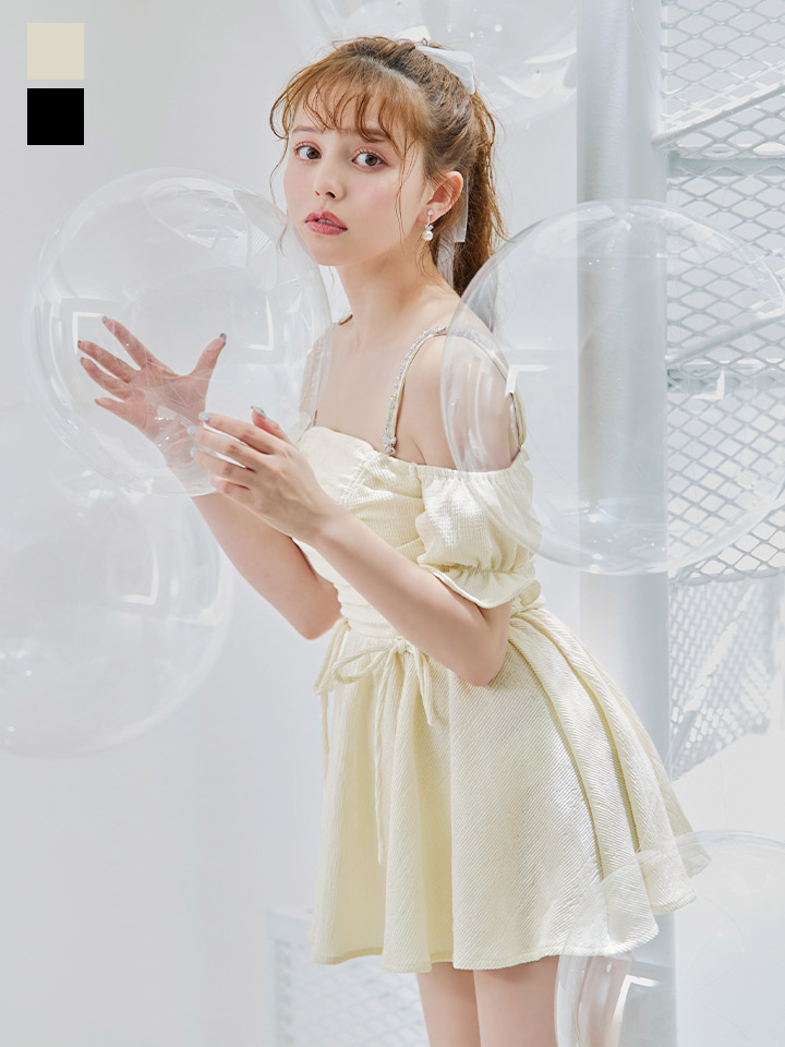 オフショルダーデザインとビジューのストラップが、可愛さとエレガンスをプラス♥