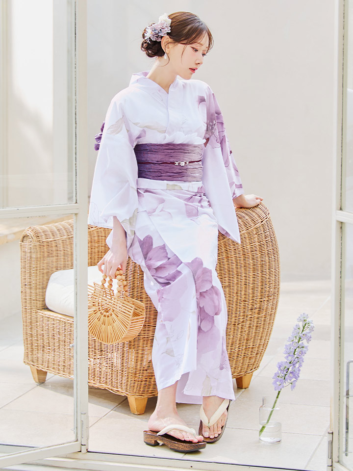 パープル系の帯で引き締めてトーンを合わせた上級コーデに。