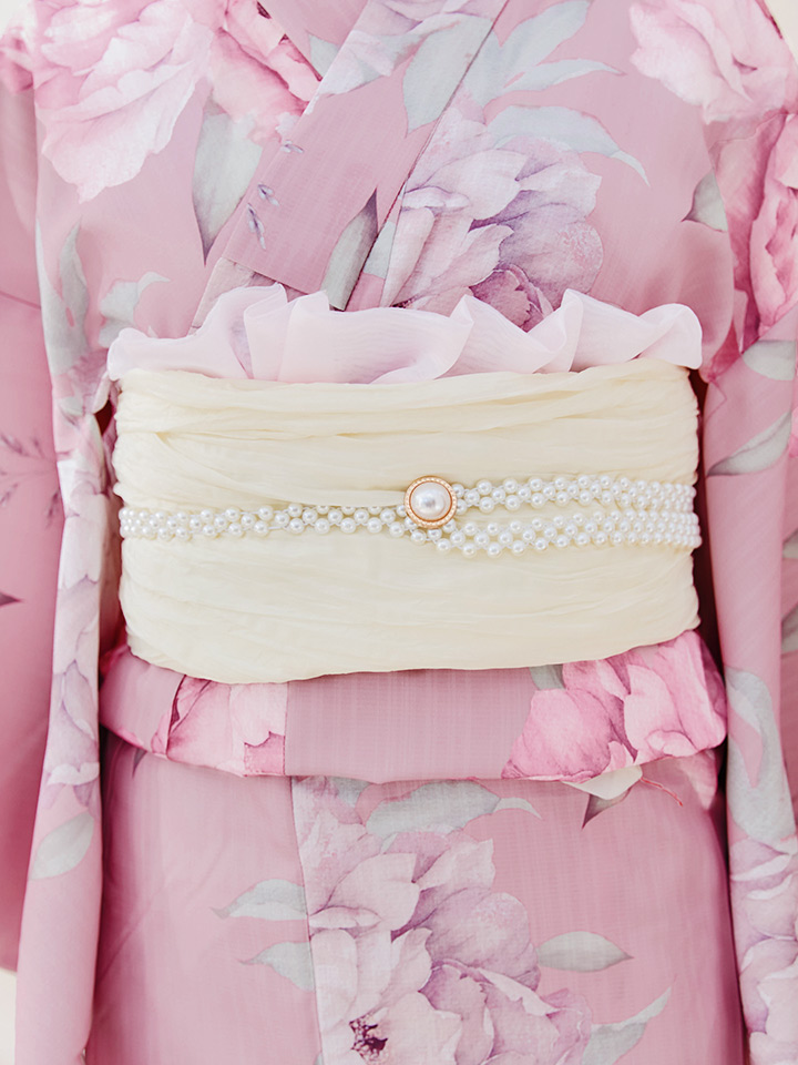 ※オプションのパール帯飾りはそのまま帯の上から結び、後ろの余った部分を帯の中にしまって着付けしております。