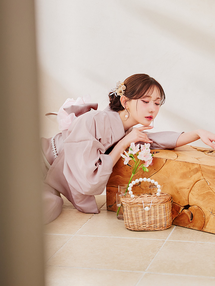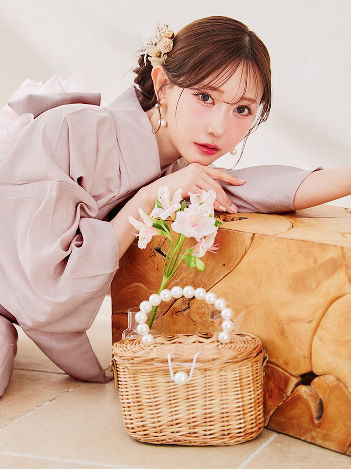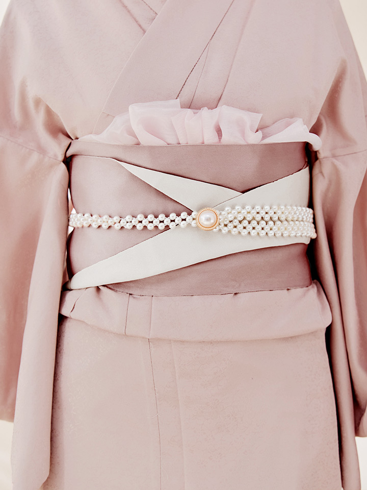 ※オプションのパール帯飾りはそのまま帯の上から結び、後ろの余った部分を帯の中にしまって着付けしております。