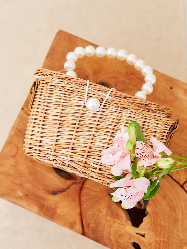 パールのハンドルの編みカゴバッグ。