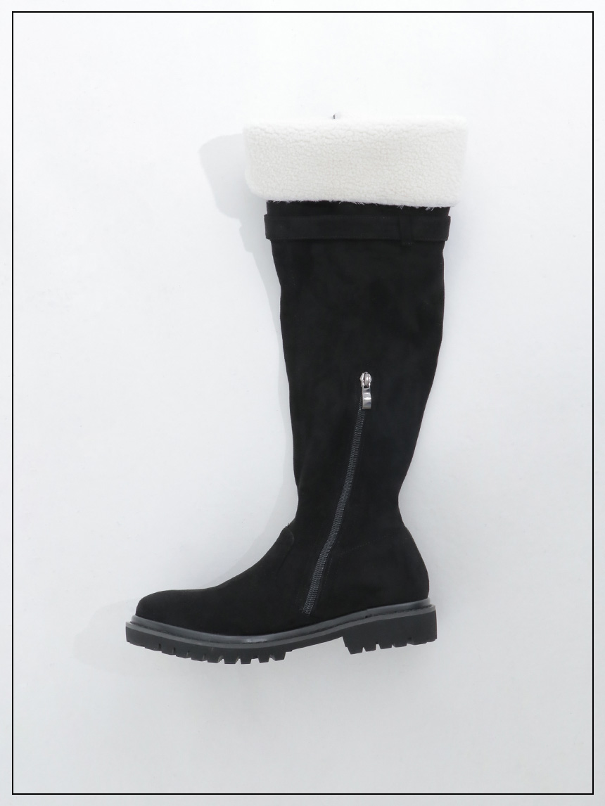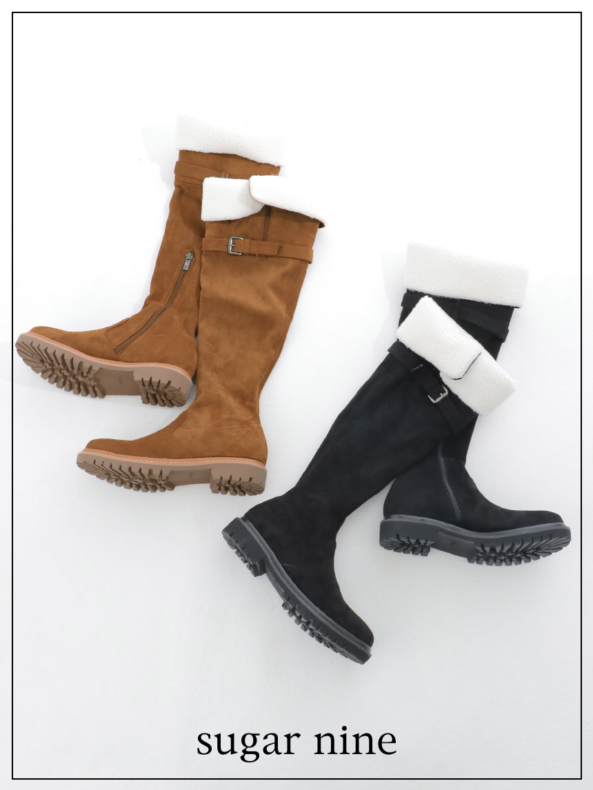 スエード素材ともこもこボアの折り返しデザインがかわいいロングブーツ。