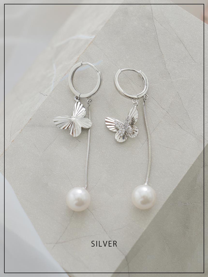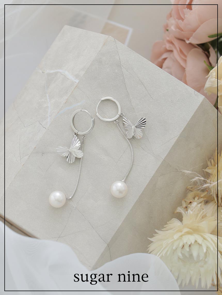 存在感のあるバタフライとパールが印象的なロングピアス。