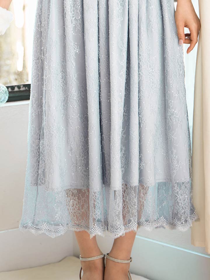 くすみカラーとスカートには刺繍レースを重ねて大人フェミニンな印象に。