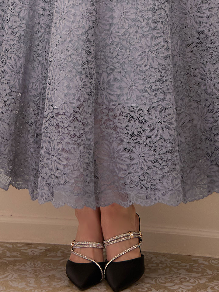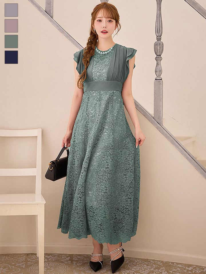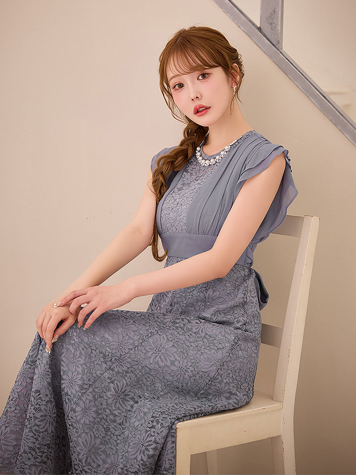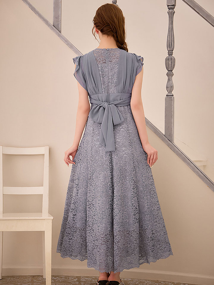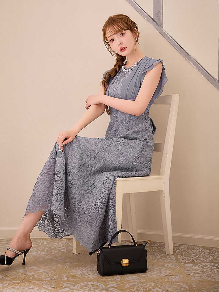 フラワーレースに柔らかいシフォンの組み合わせが大人フェミニンなミモレ丈ワンピースドレス♡