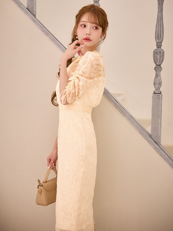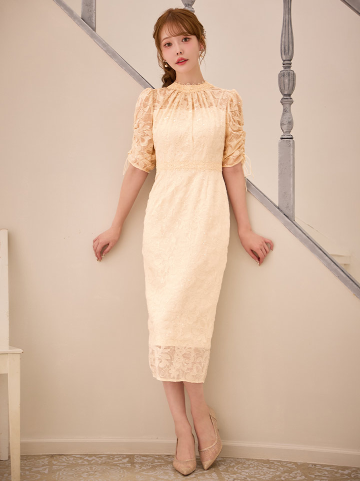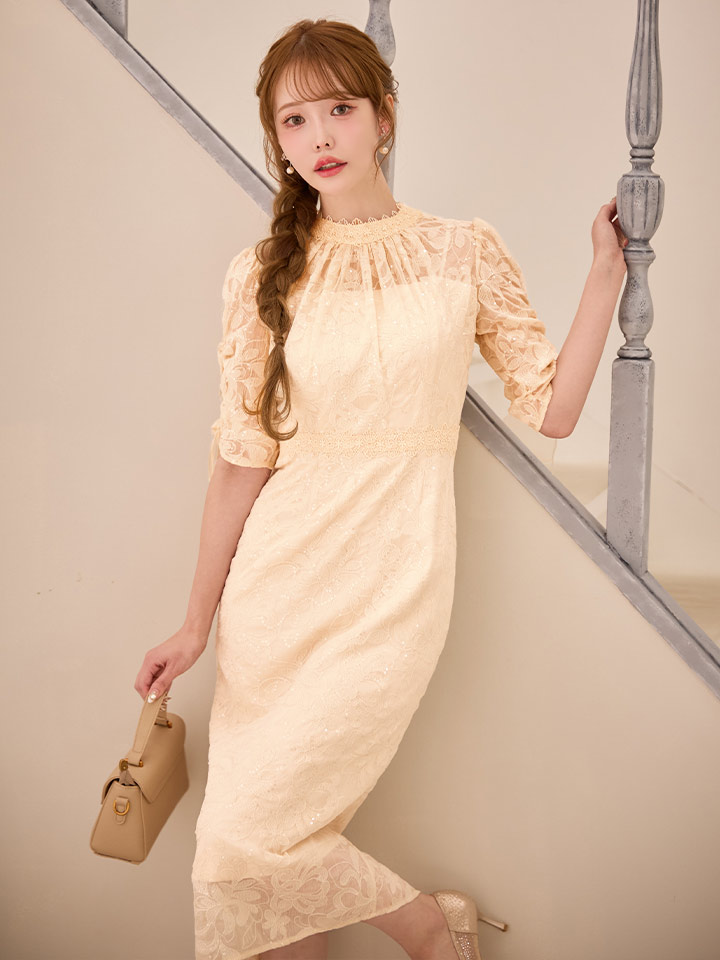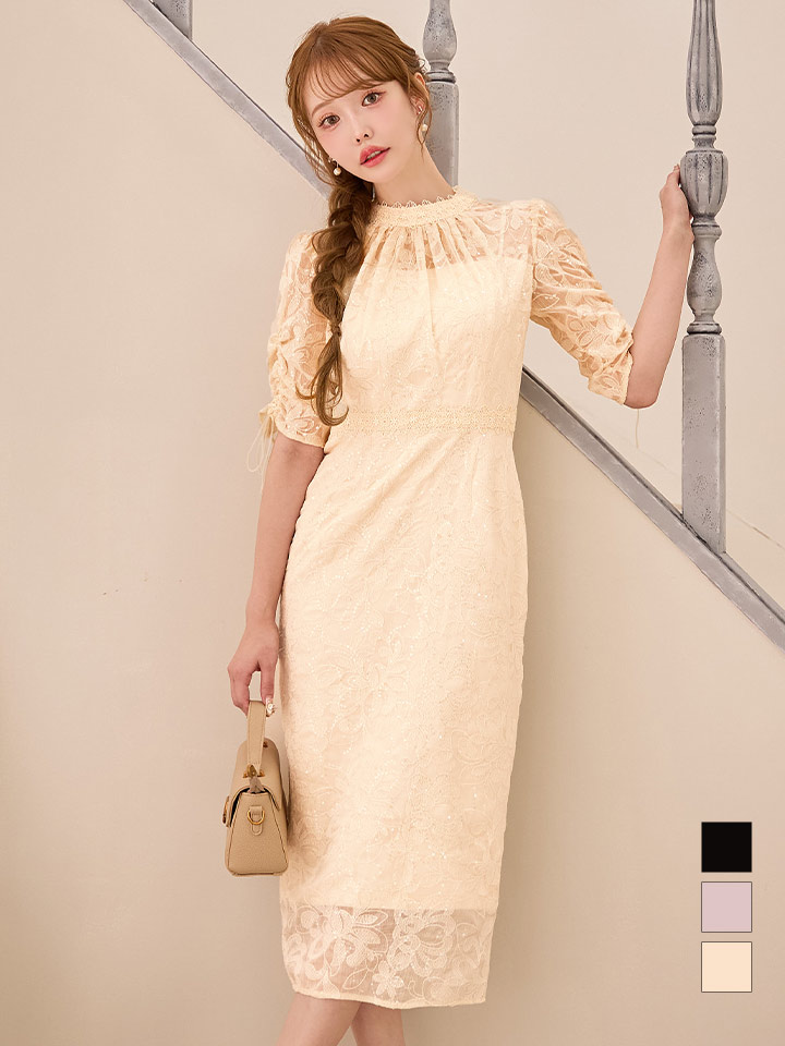 XLサイズあり【AMORA GRACE / アモーラグレース】 オケージョンドレス/ パーティードレス/ お呼ばれドレス/ 総レース/ ハイネック/ ギャザースリーブ/ ハイウエスト/ ミモレ丈/ ワンピース[OF05]