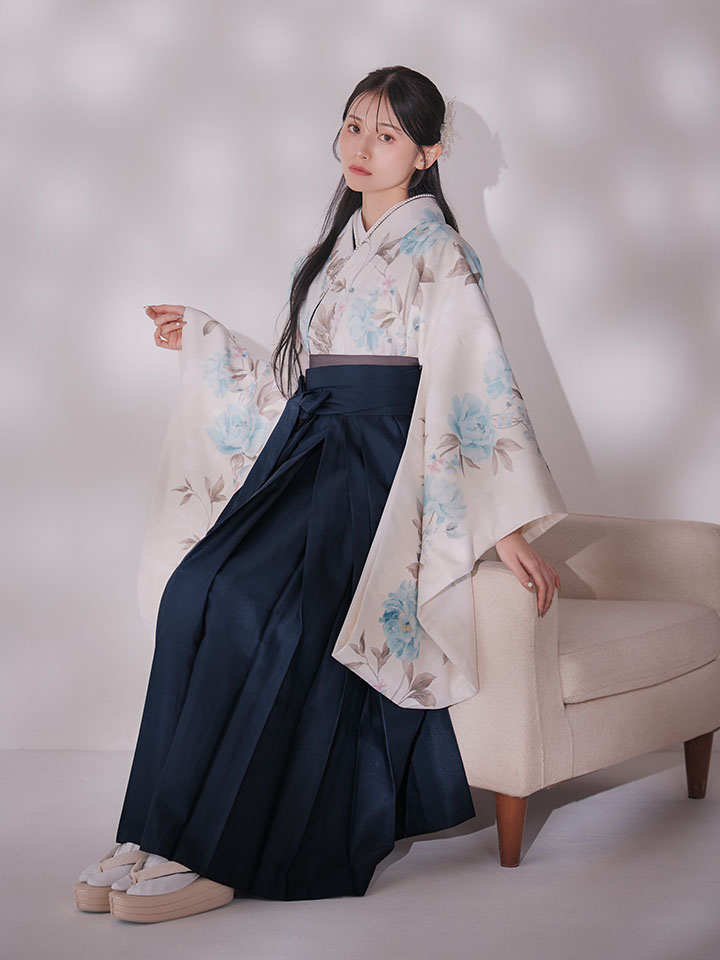【即日発送】ブルー芍薬 ホワイト二尺袖着物【卒業袴3点セット 二尺袖着物/帯/袴】 [HR-107-ok-BL-F-25MU-251220]