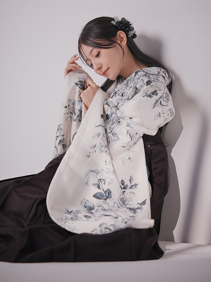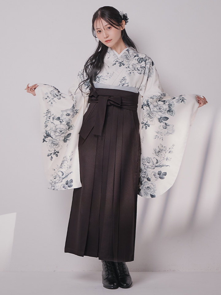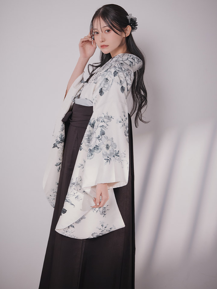 【予約商品 / 1月中旬発送予定】グレーフラワーブーケ ホワイト二尺袖着物【卒業袴3点セット 二尺袖着物/帯/袴】