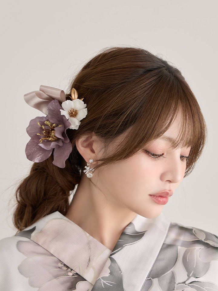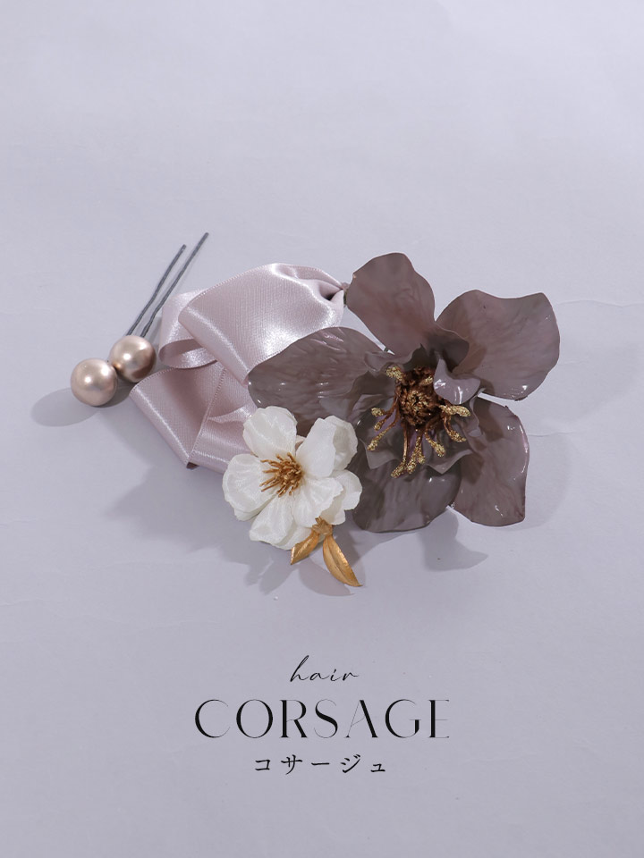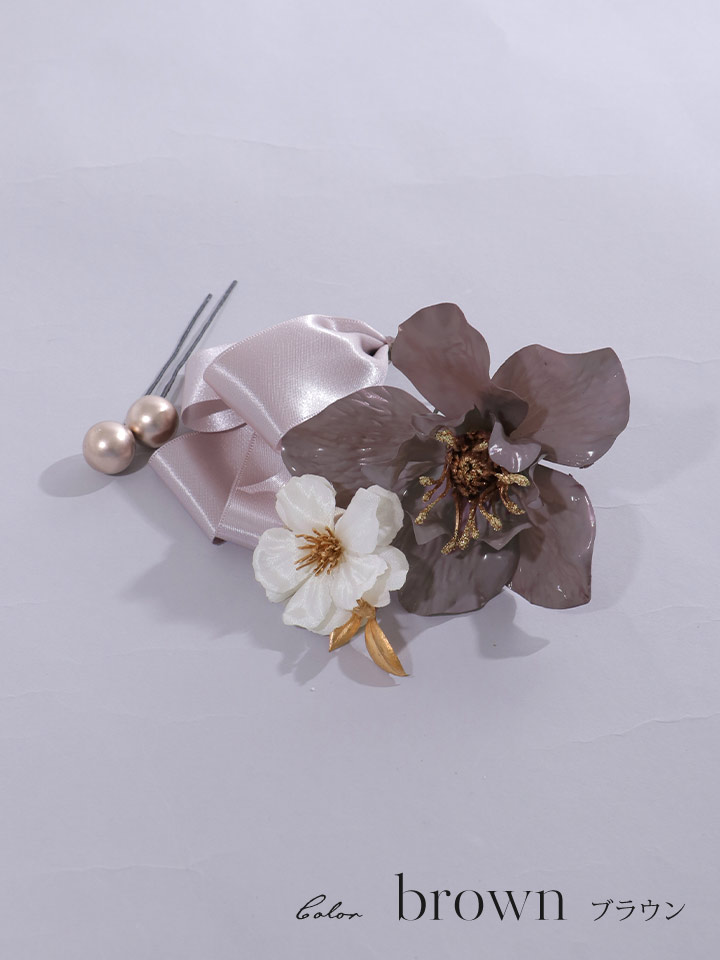 大人可愛い大輪のお花とヘアピックの5点セットです。リボンやパールピックがセットになっているため、ボリュームの調整も自由自在。