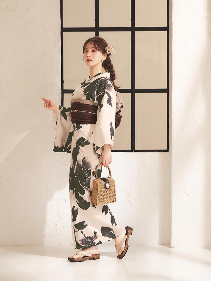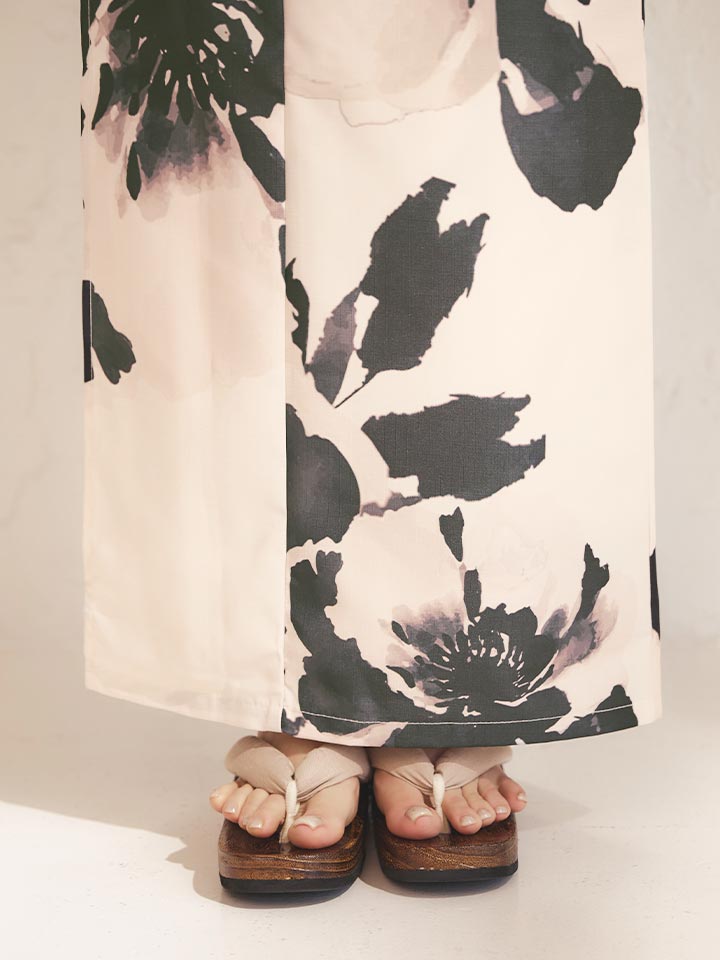墨色の花が美しく咲き誇る、和の趣あふれるモノトーン浴衣。