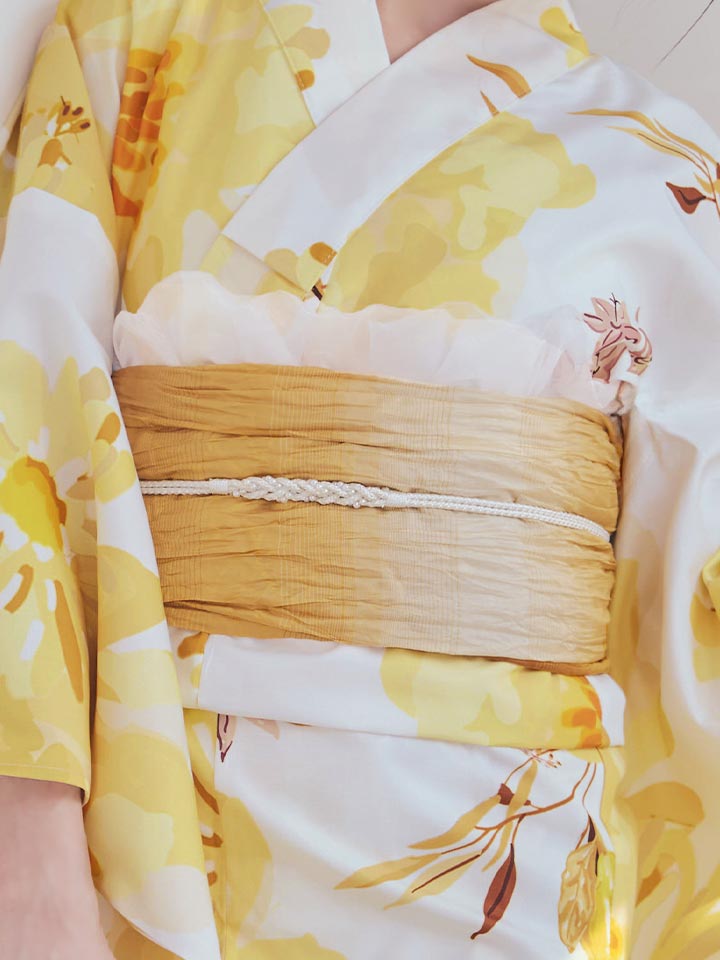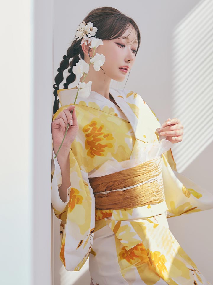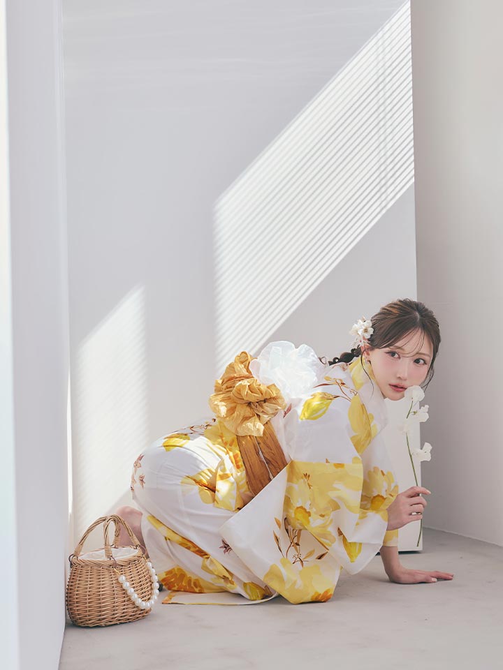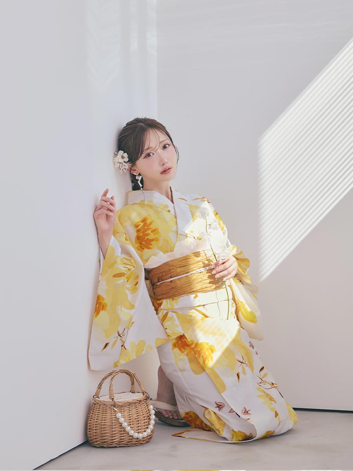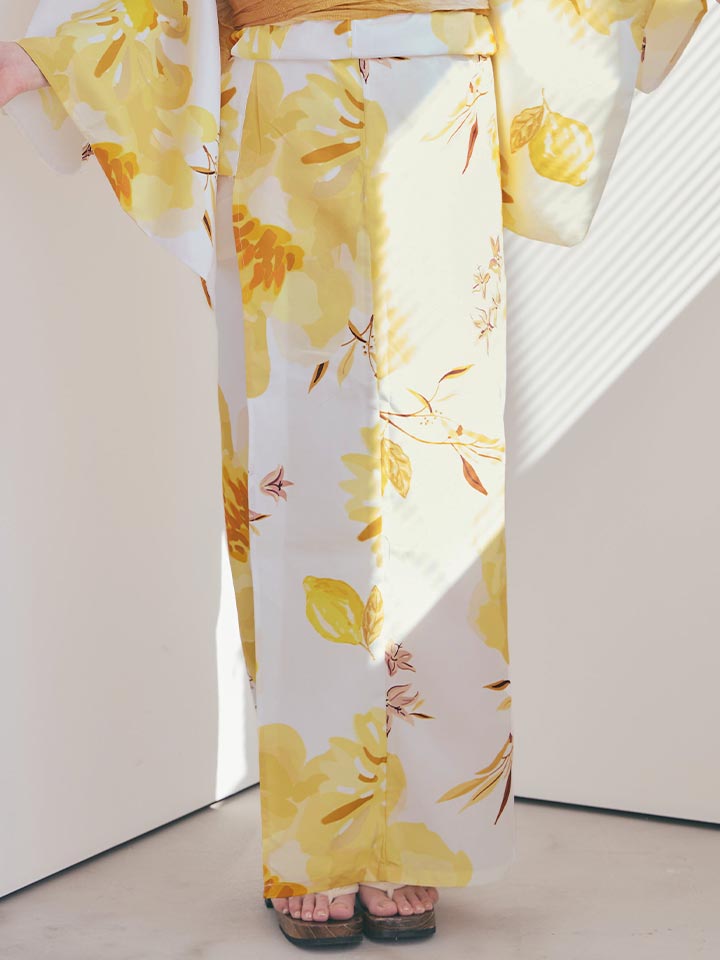 陽だまりのようなイエローの花々をあしらった、明るく華やかな浴衣。