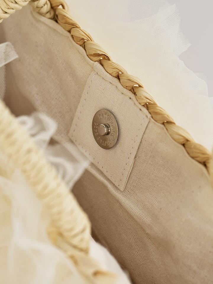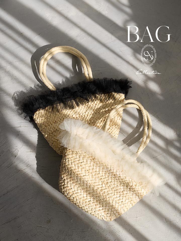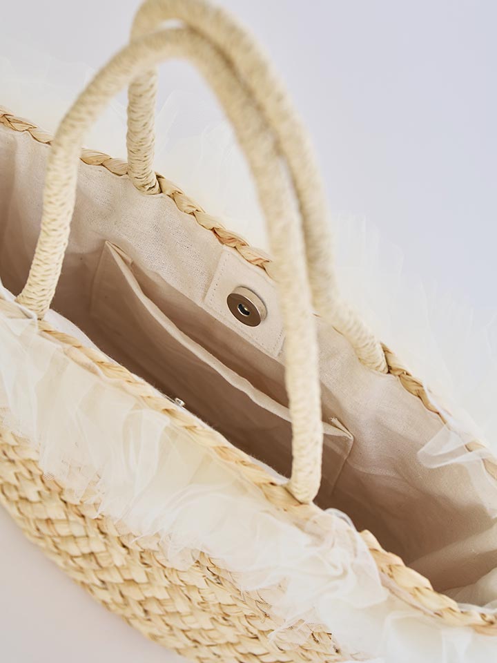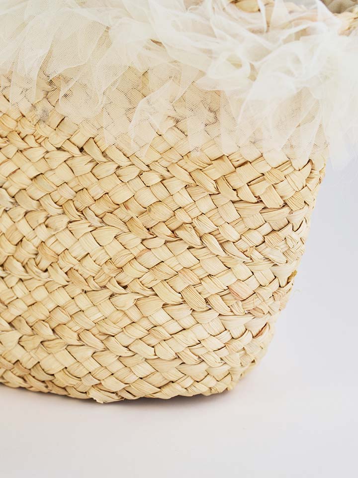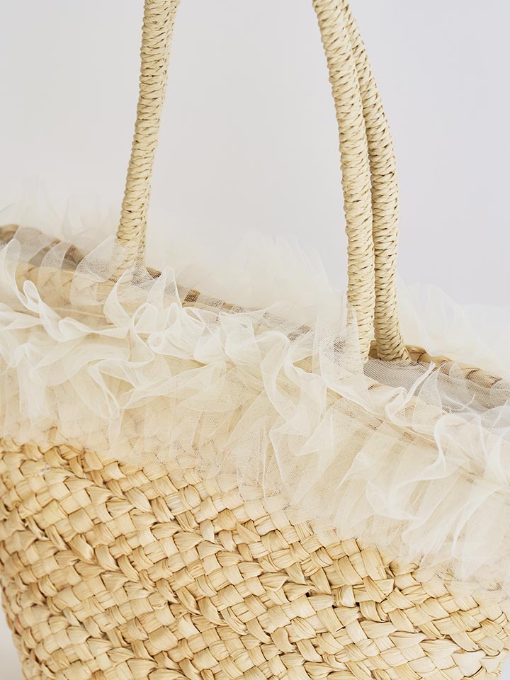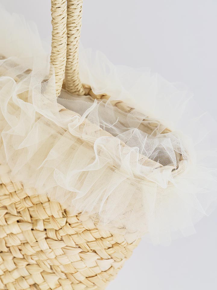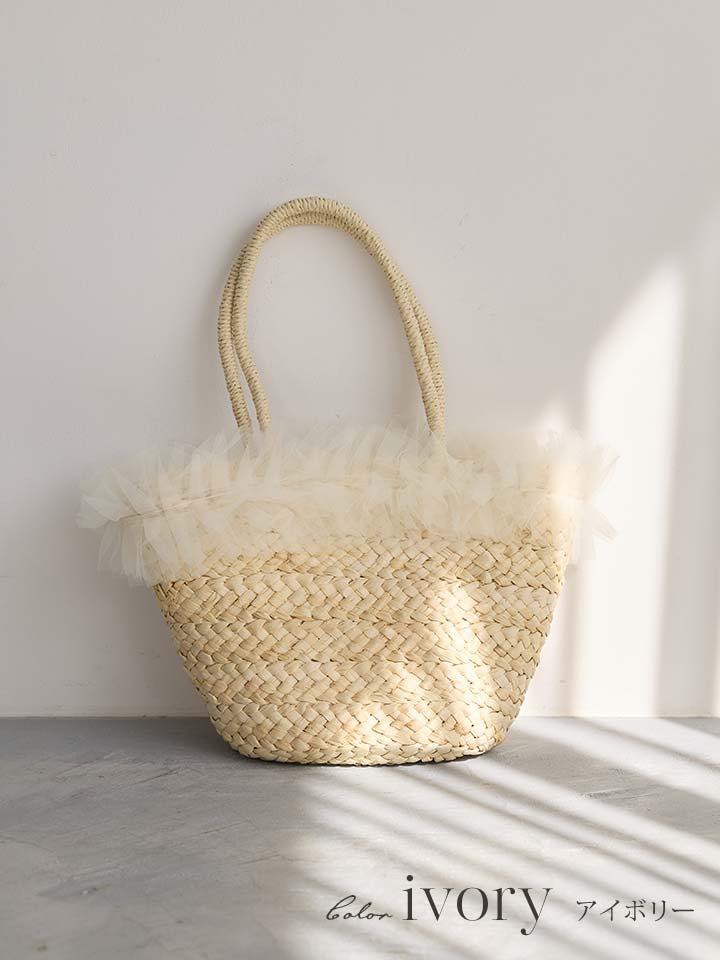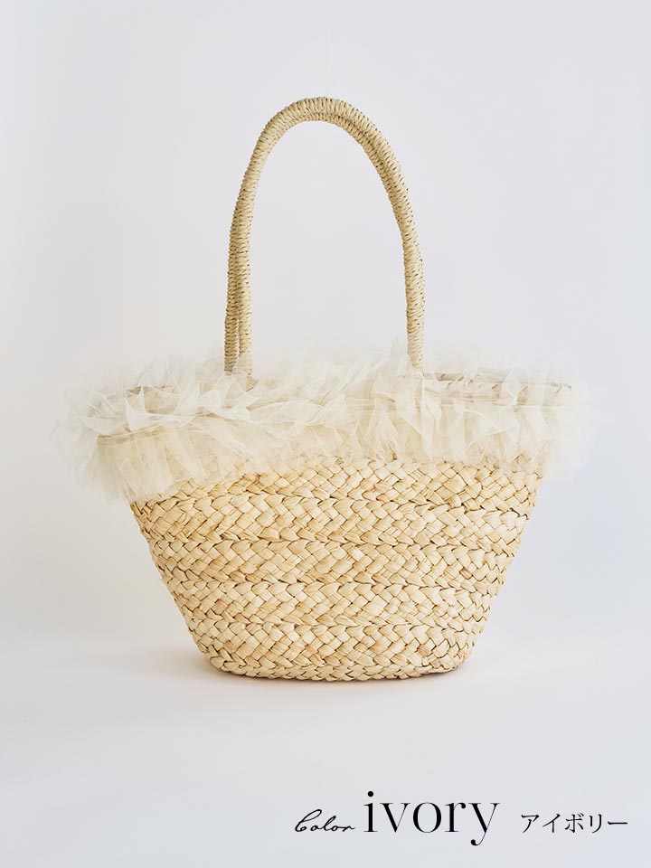ナチュラルなカゴ素材にやわらかなチュールフリルが可愛らしいバッグ。