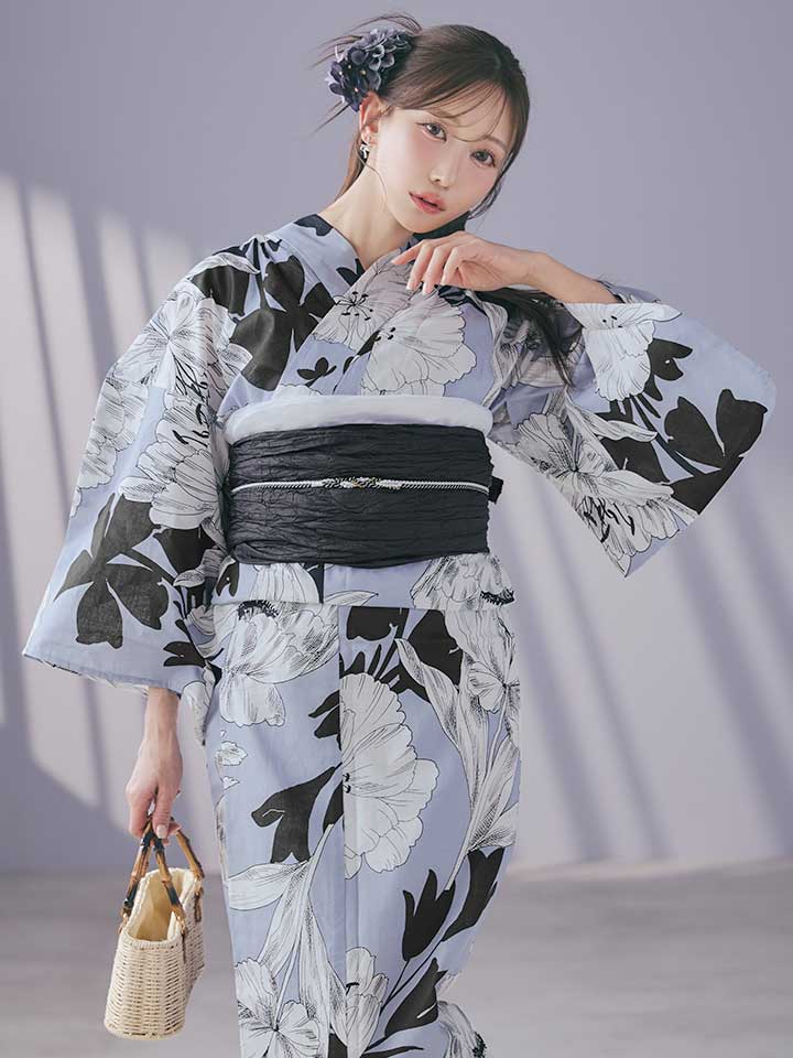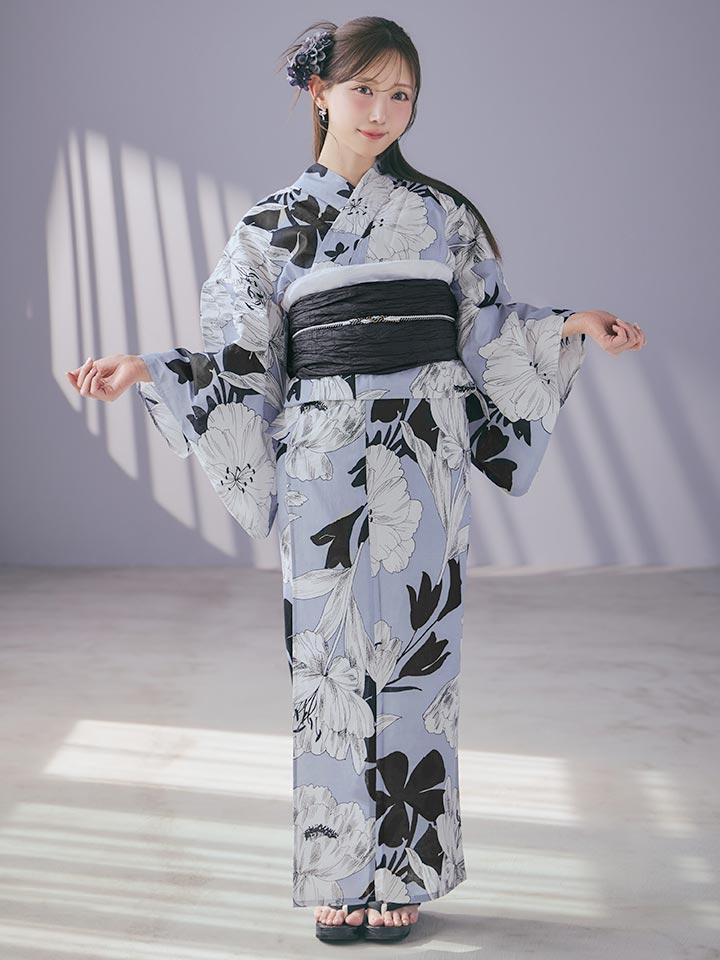 【即日発送】ブルーグレーモダンフラワー浴衣【浴衣3点セット 浴衣/帯/下駄】[OF04] [Y-9307-kj-GY-F-26YI-260407]