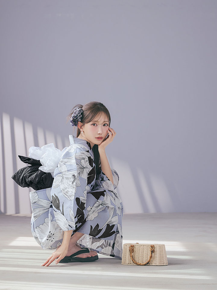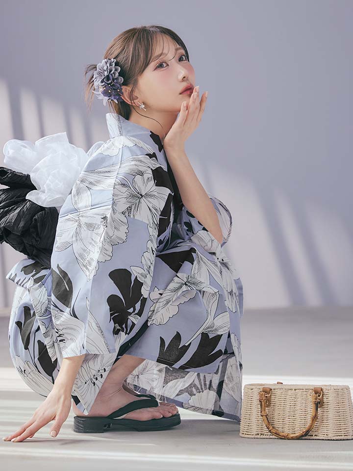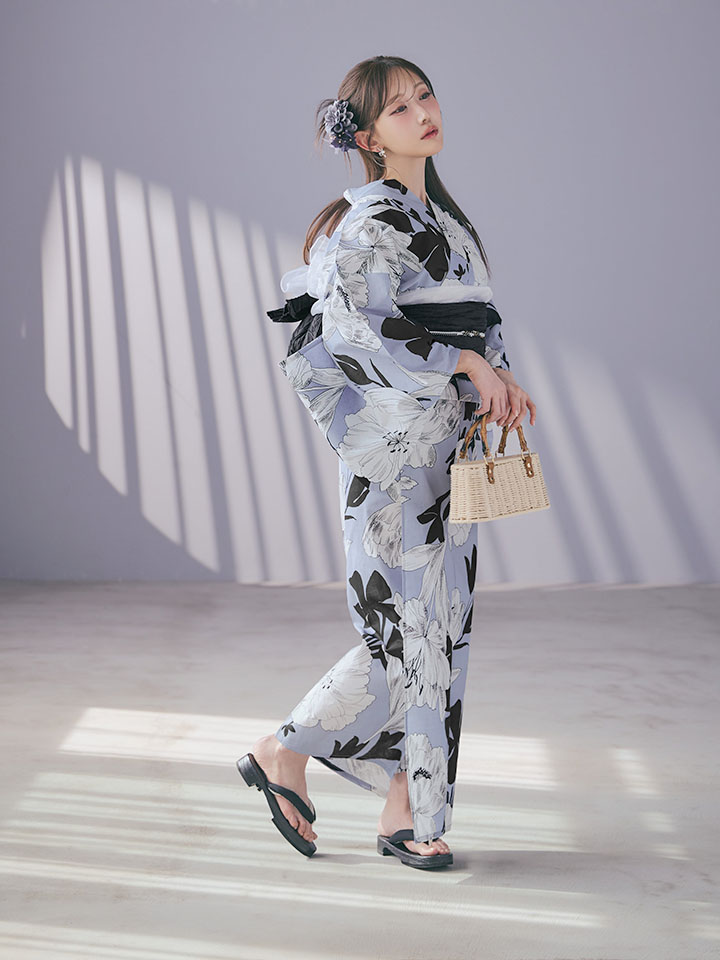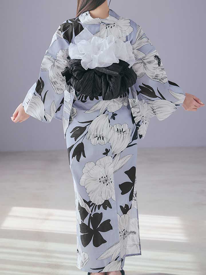 ブラックとホワイトで描かれた花柄が印象的な浴衣。