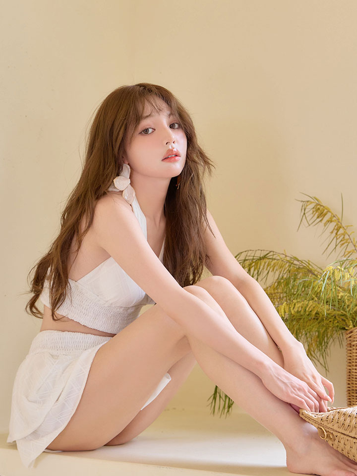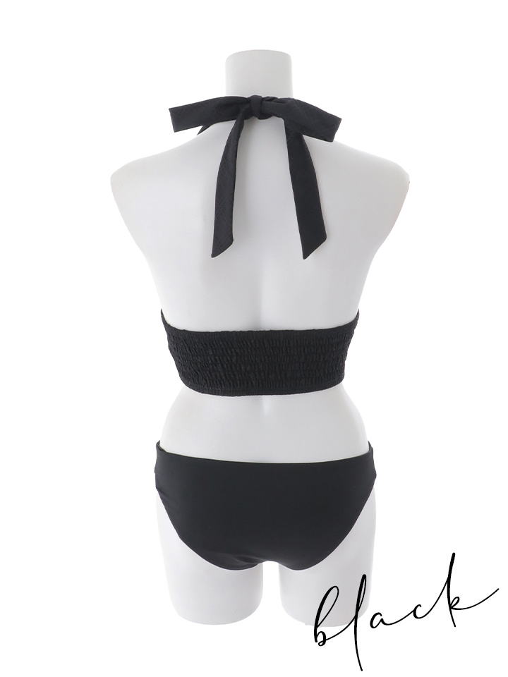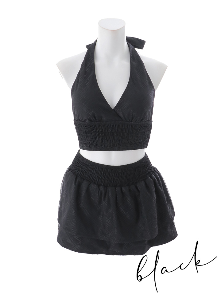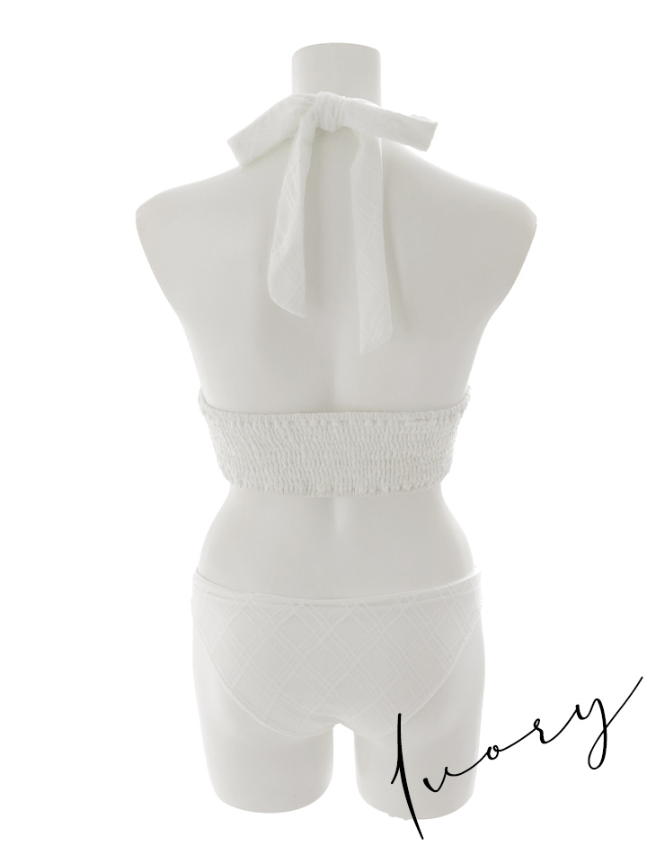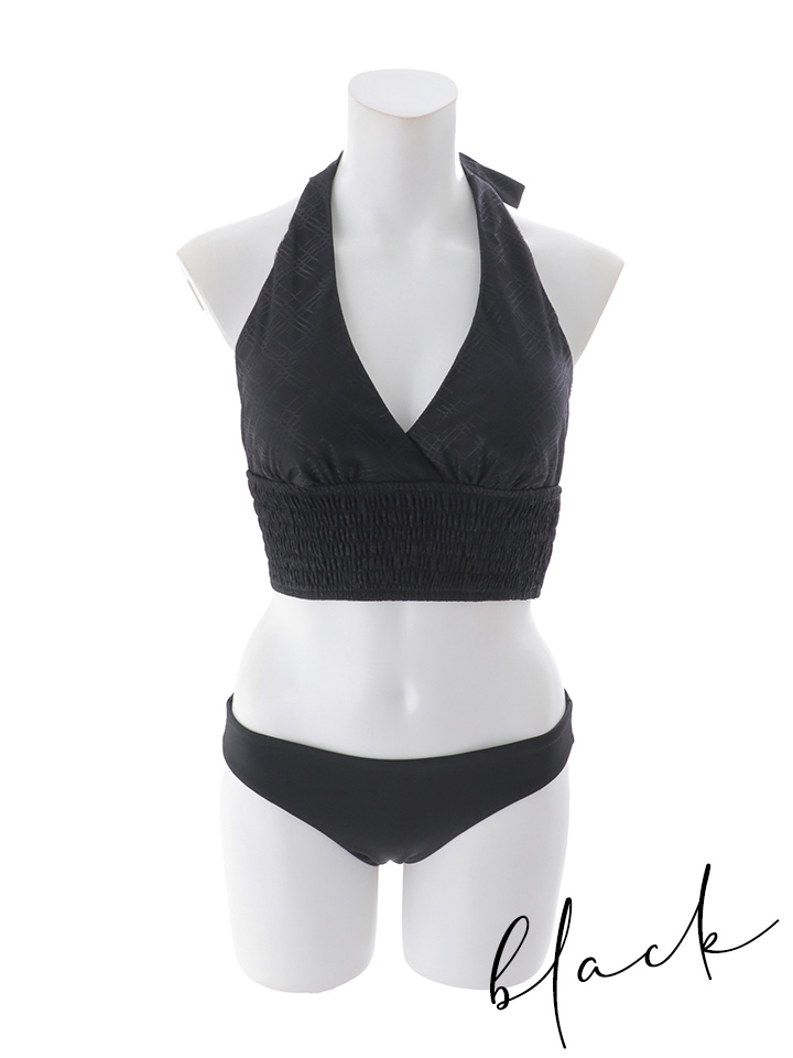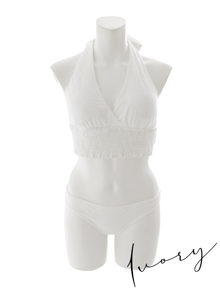 さりげないチェックレース生地が重なり、上品な立体感を演出するホルターネック水着。