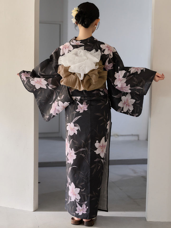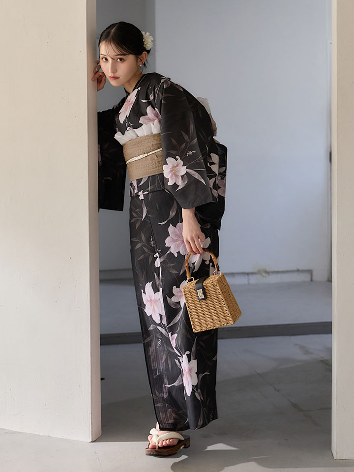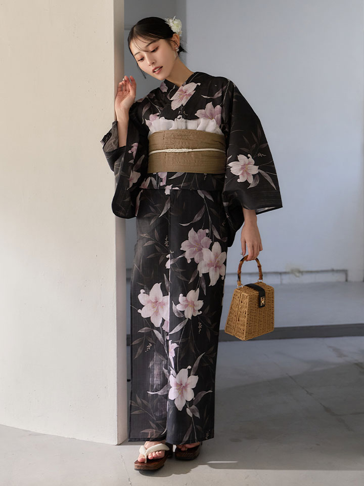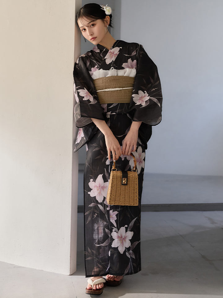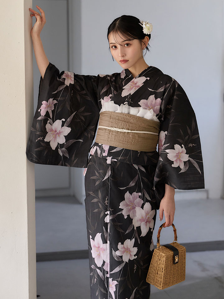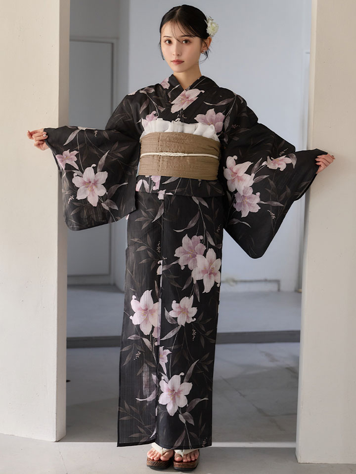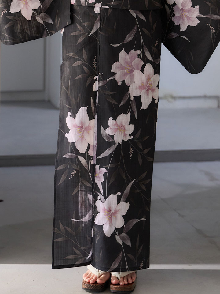送料無料!ホワイトリリー黒地浴衣【浴衣3点セット 浴衣/帯/下駄】[OF04]【予約 / 6月中旬発送予定】 [Y-9411-ok-B-F-26MU-260422]