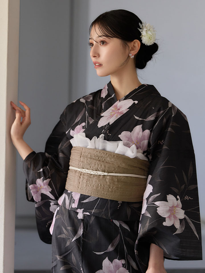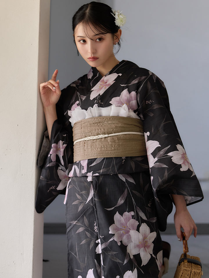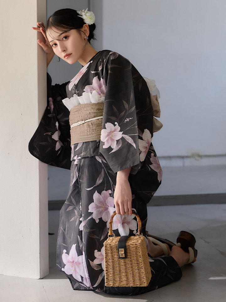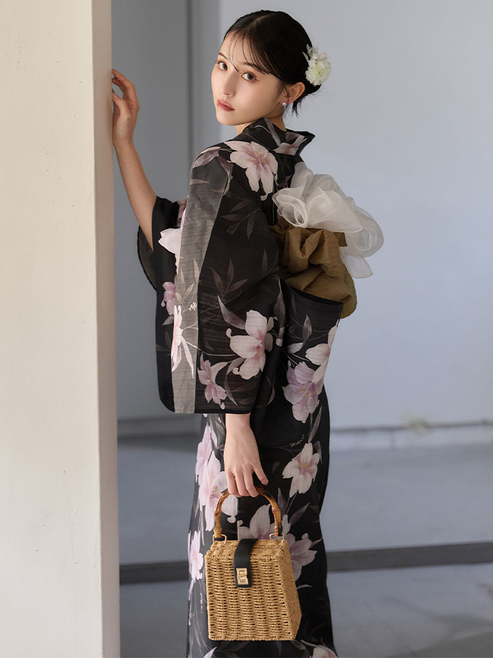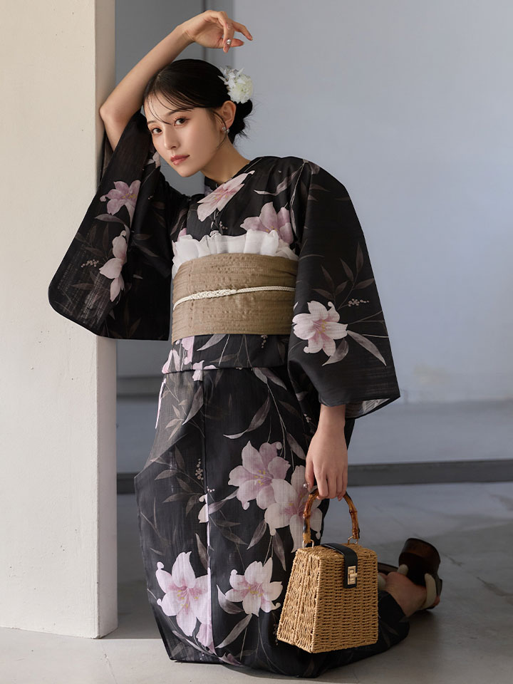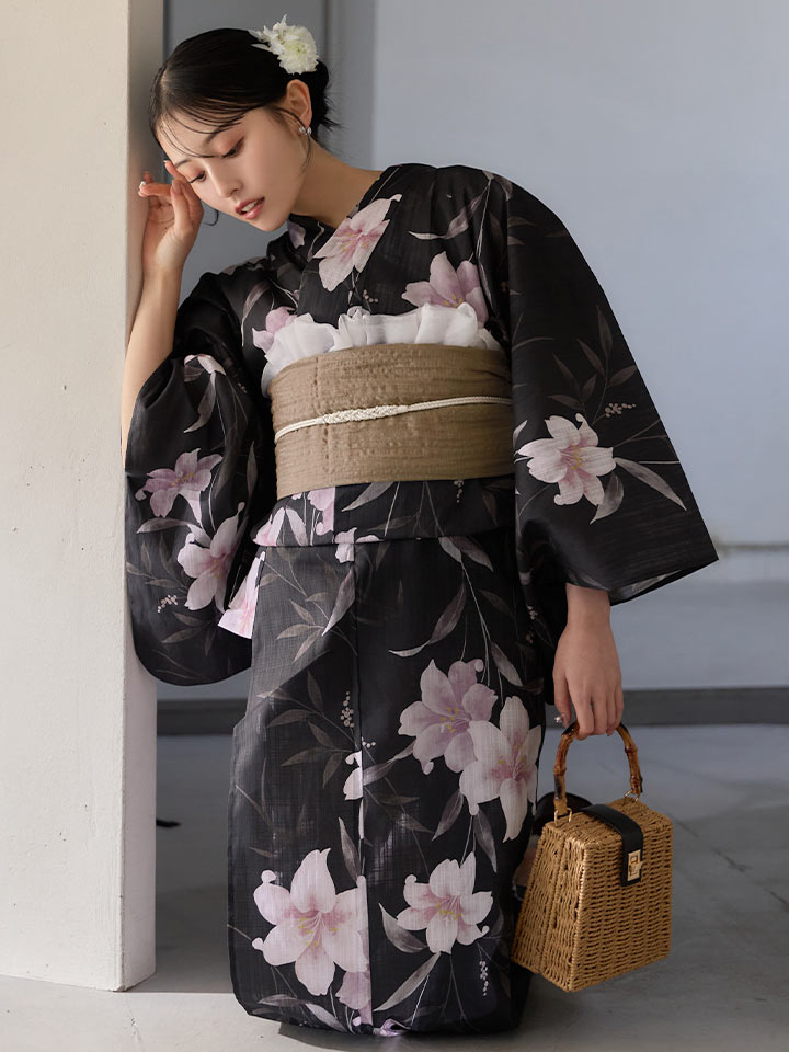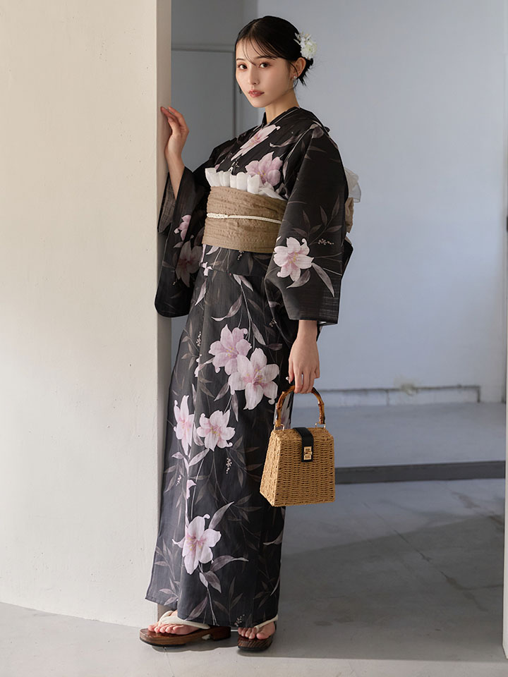 送料無料!ホワイトリリー黒地浴衣【浴衣3点セット 浴衣/帯/下駄】[OF04]【予約 / 6月中旬発送予定】 [Y-9411-ok-B-F-26MU-260422]
