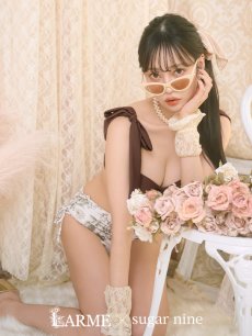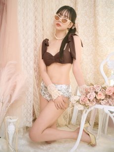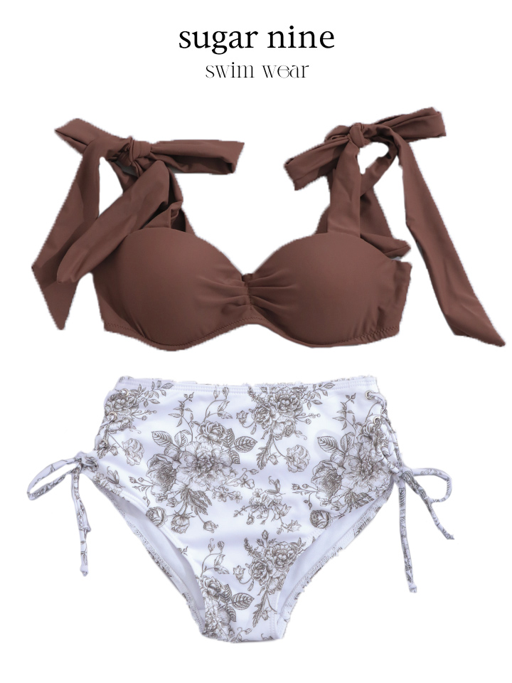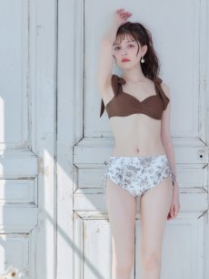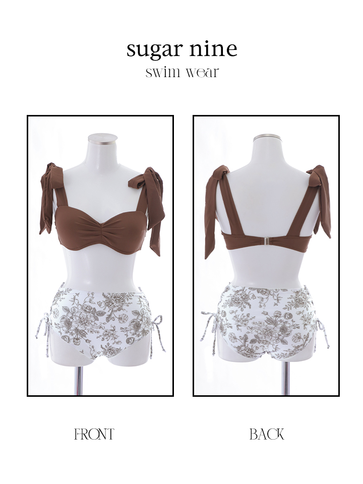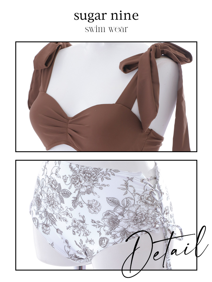 細い線画タッチで描かれた花柄はシンプルの中にも大胆さがある大人フェミニンなビキニに仕上げました。さり気ない肩のリボンで大人っぽくなりすぎない1枚に。
