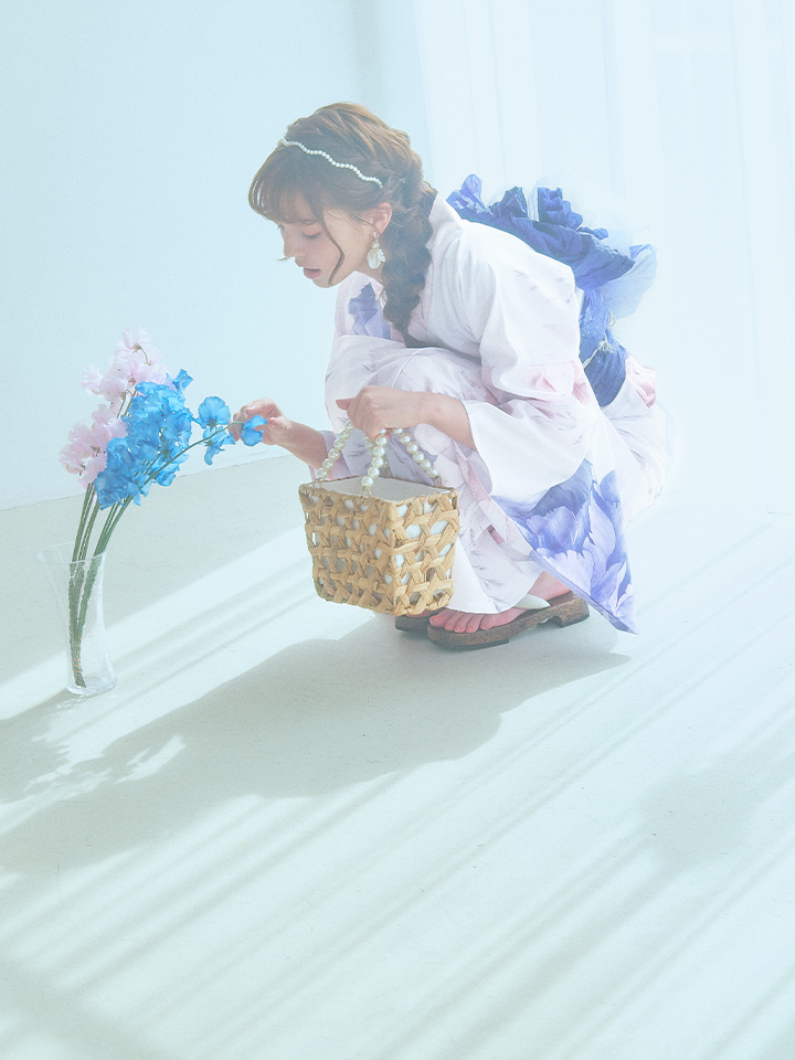 大胆に咲くブルーとピンクの牡丹が印象的な浴衣。