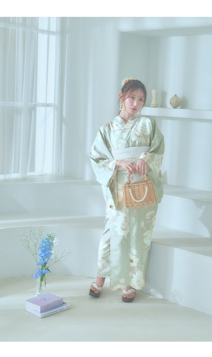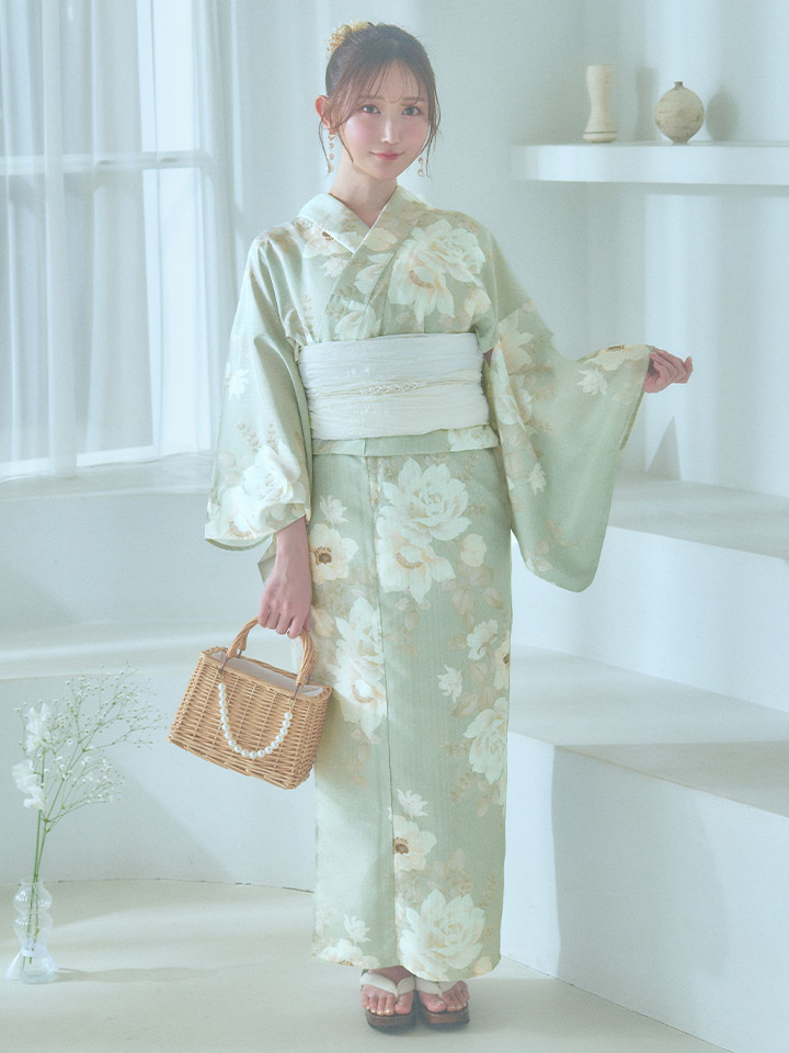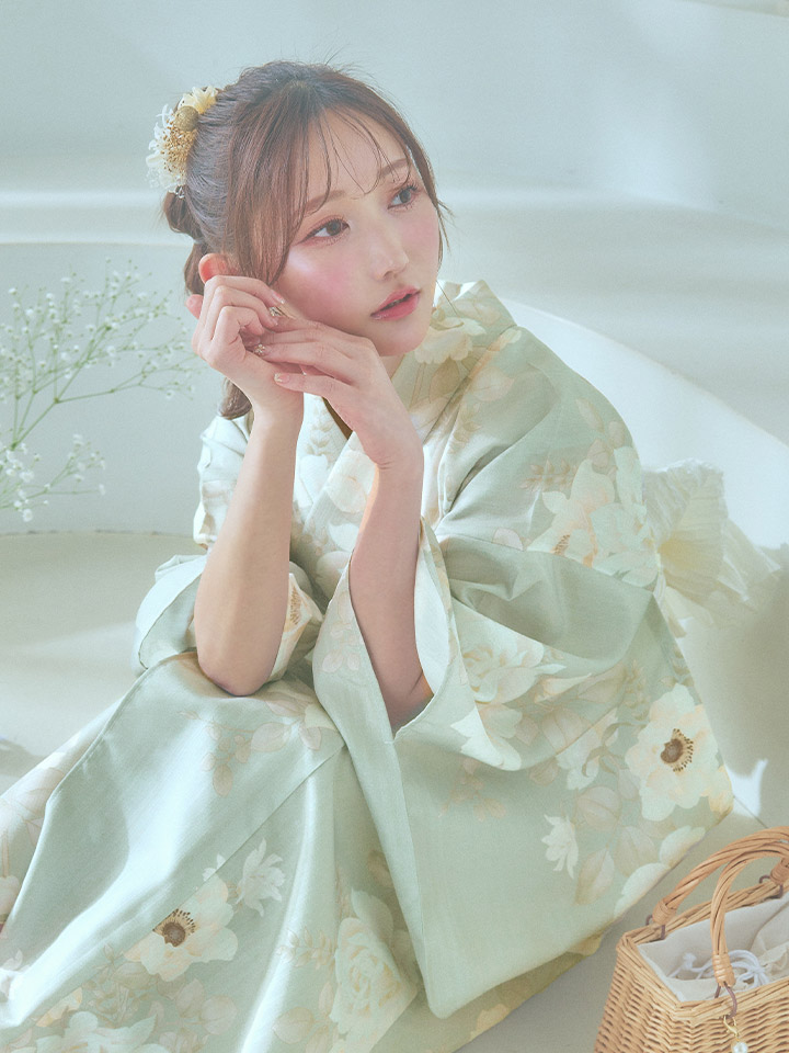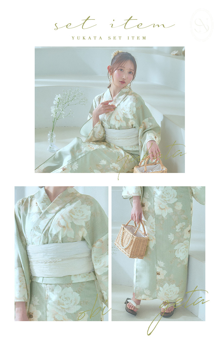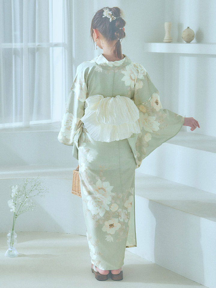【即日発送】くすみグリーン×ホワイトフラワー浴衣 【浴衣3点セット 浴衣/帯/下駄】 [YMT] [Y-9013-ok-BL-F-24YI]