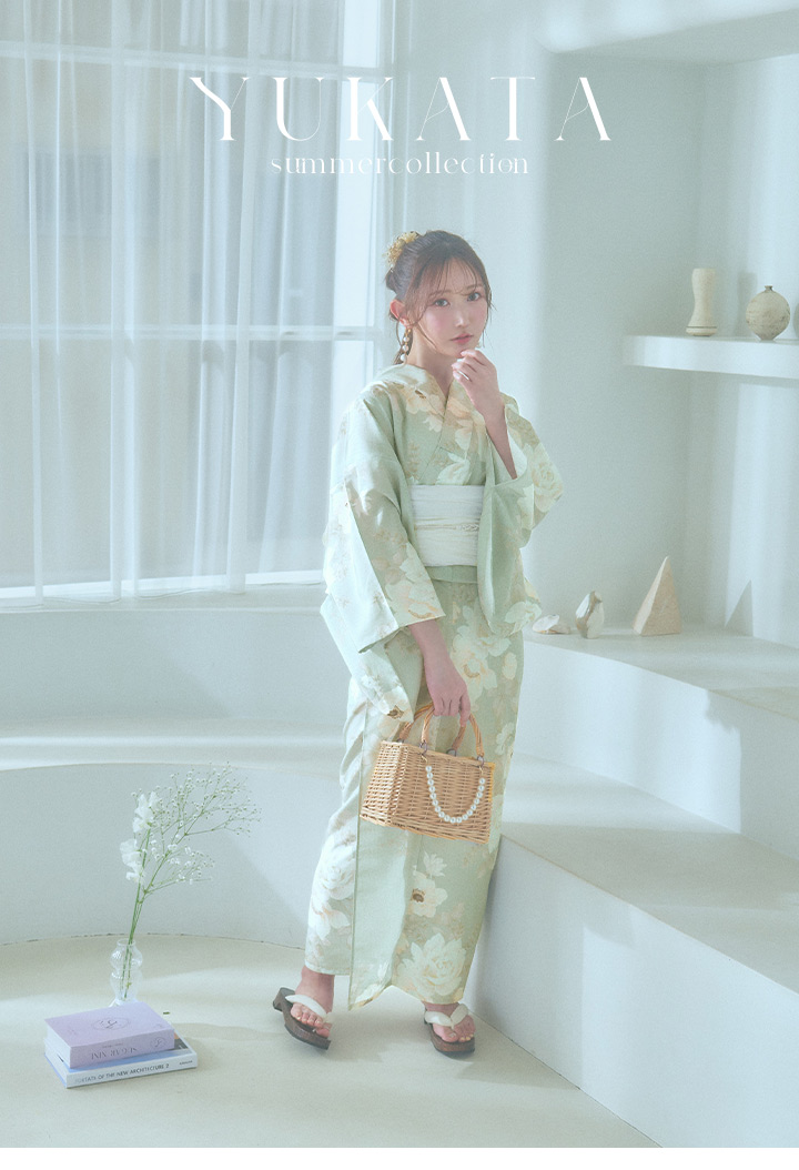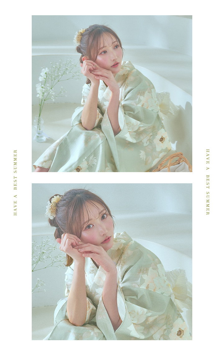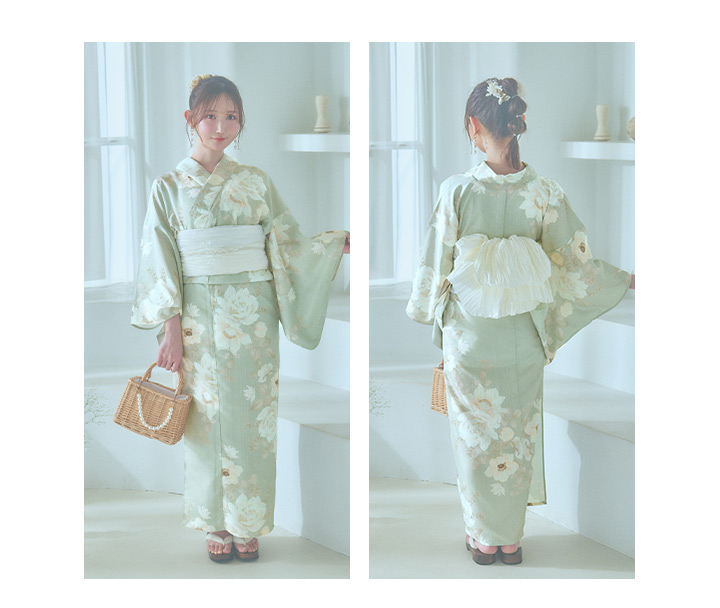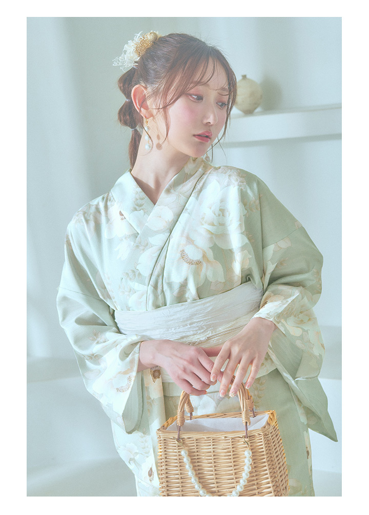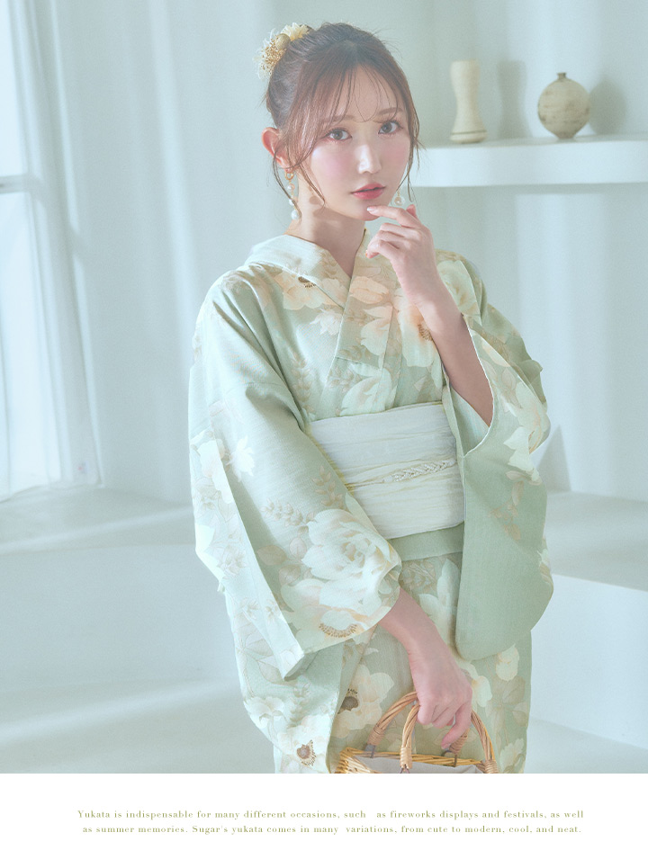 【即日発送】くすみグリーン×ホワイトフラワー浴衣 【浴衣3点セット 浴衣/帯/下駄】 [YMT] [Y-9013-ok-BL-F-24YI]