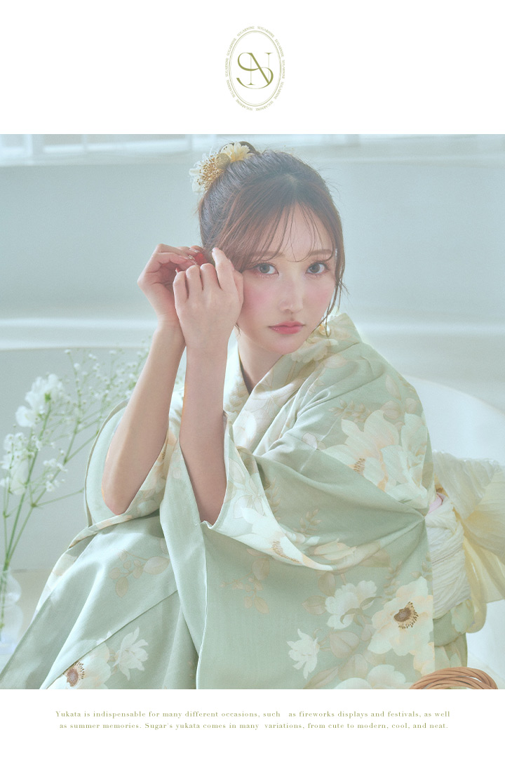 【即日発送】くすみグリーン×ホワイトフラワー浴衣 【浴衣3点セット 浴衣/帯/下駄】 [YMT]