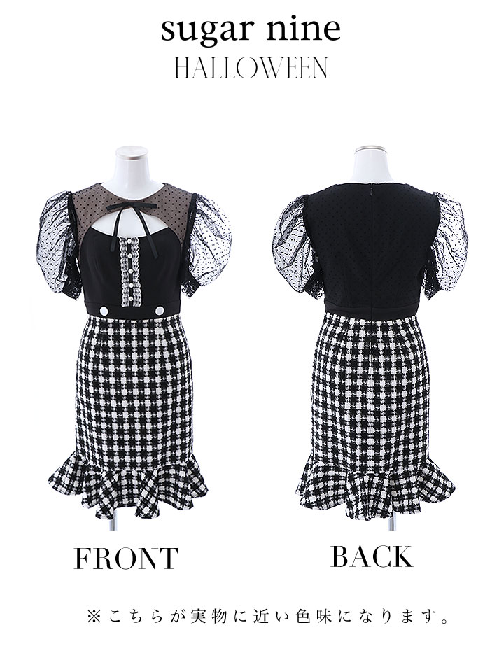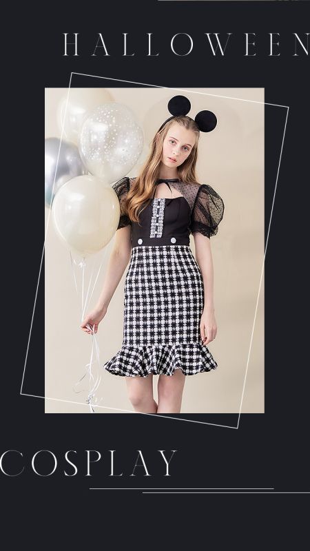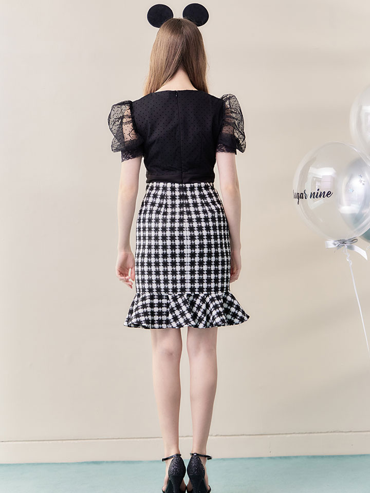 マウス ねずみ ネズミ ワンピース マーメイドスカート ミディアムスカート 五分袖 半袖 ハーフスリーブ ミディアム丈 ミモレ丈 露出が少ない ロングスカート アニマル 動物 コスプレ チェックツイード
