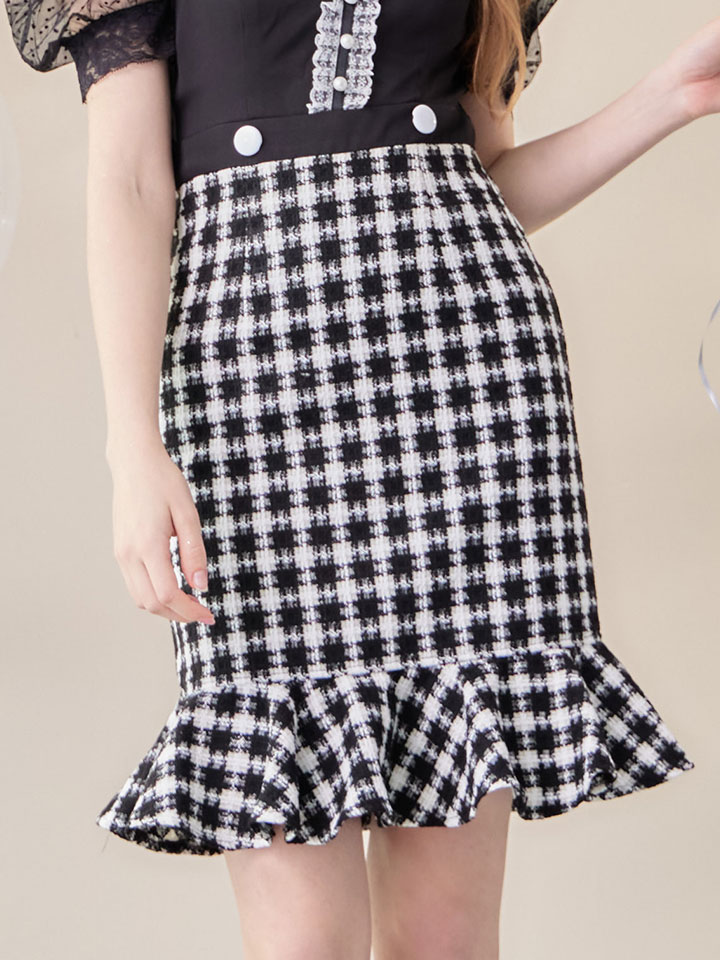 千鳥柄スカートで上品な印象に。