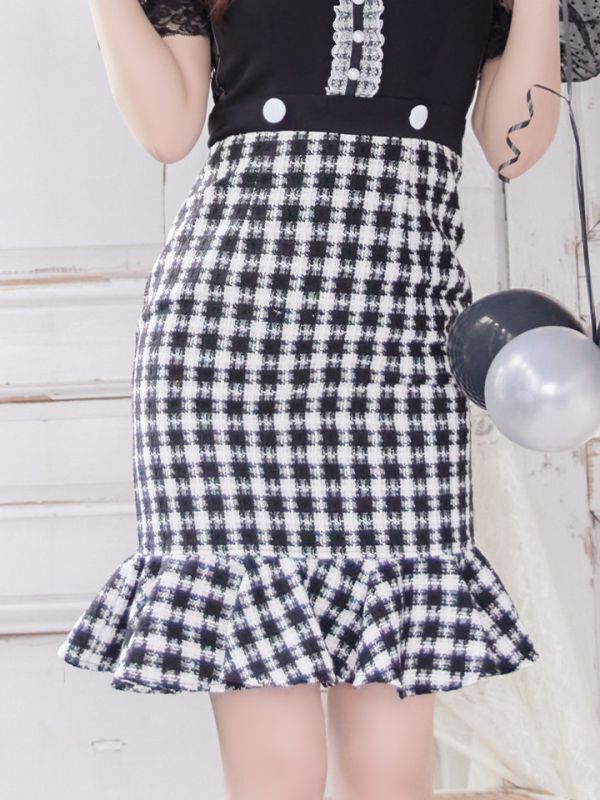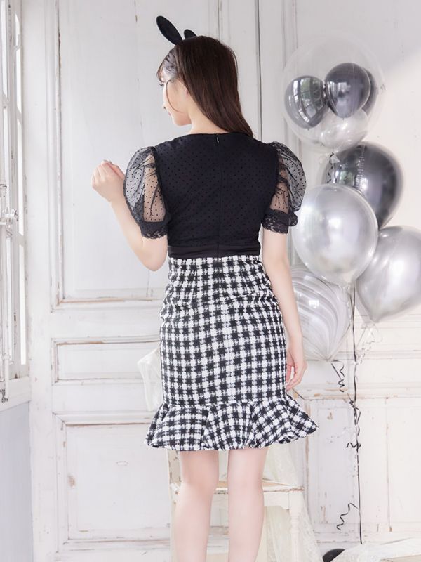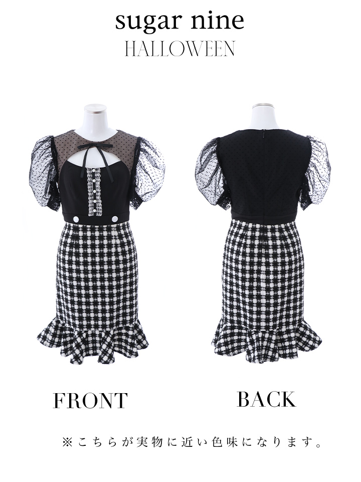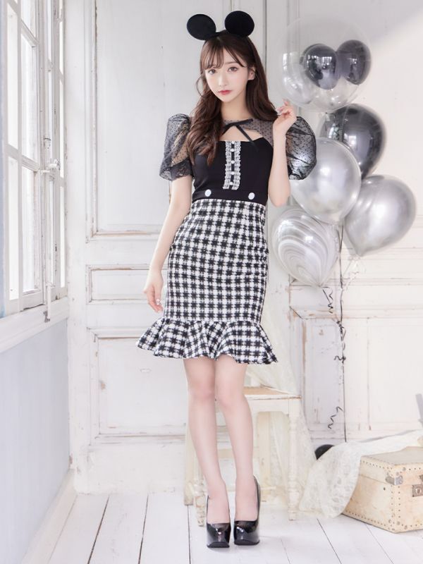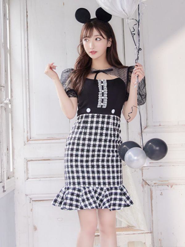 マウス ねずみ ネズミ ワンピース マーメイドスカート ミディアムスカート 五分袖 半袖 ハーフスリーブ ミディアム丈 ミモレ丈 露出が少ない ロングスカート アニマル 動物 コスプレ チェックツイード